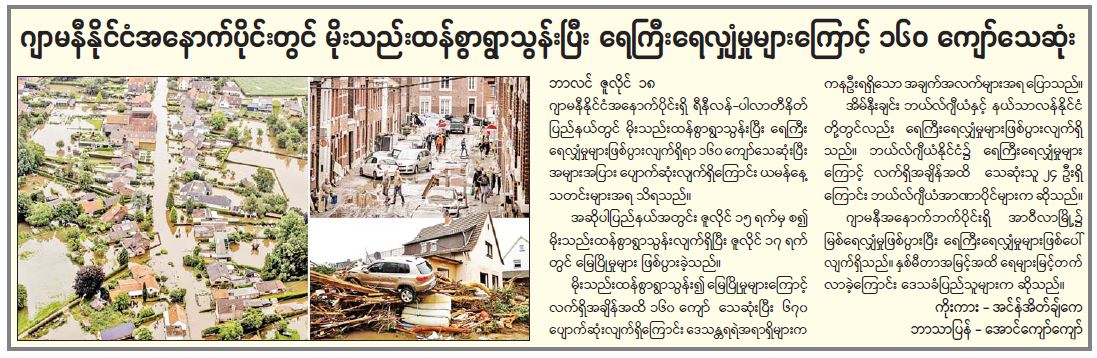 ဂျာမနီနိုင်ငံအနောက်ပိုင်းတွင် မိုးသည်းထန်စွာရွာသွန်းပြီး ရေကြီးရေလျှံမှုများကြောင့် ၁၆၀ ကျော် သေဆုံး