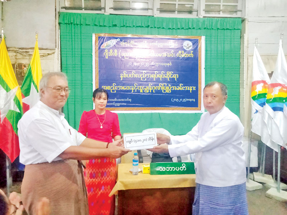 ဆက်လက်၍ အသင်းဥက္ကဋ္ဌက အသင်းသားများအား အကျိုးအမြတ်ခွဲဝေ ငွေကျပ် သိန်း ၄၁၀ ဒသမ ၂၀ အားပေးအပ်ခဲ့ပြီး မြို့နယ်သမဝါယမဦးစီးဌာန ဦးစီးအရာရှိ ဦးခင်ဇော်နှင့် တာဝန်ရှိသူများက တက္ကသိုလ်ဝင်စာမေးပွဲတွင်ထူးချွန်အောင်မြင်သော အသင်းသားများ၏ သားသမီးများအား ဂုဏ်ပြုချီးမြှင့်ခဲ့‌ကြောင်း သိရသည်။