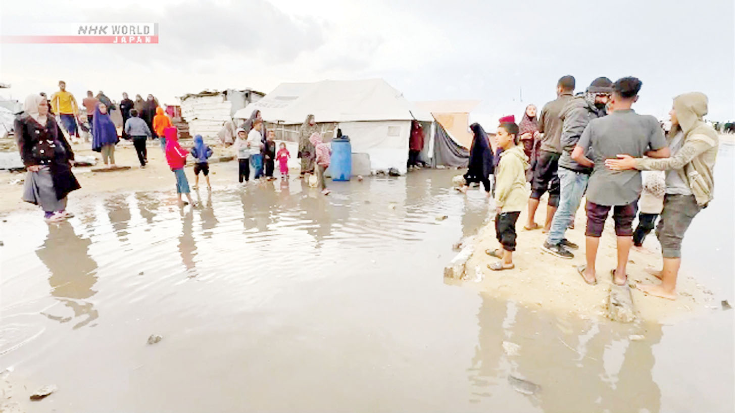 ဂါဇာကမ်းမြောငတစ်လျှောက် ယမန်နေ့က မိုးသည်းထန်စွာရွာသွန်းမှုကြောင့် ရွှေ့ပြောင်းဒုက္ခသည်များ၏ တဲများအတွင်းသို့ မိုးရေများ ဝင်ရောက်ခဲ့သည်။