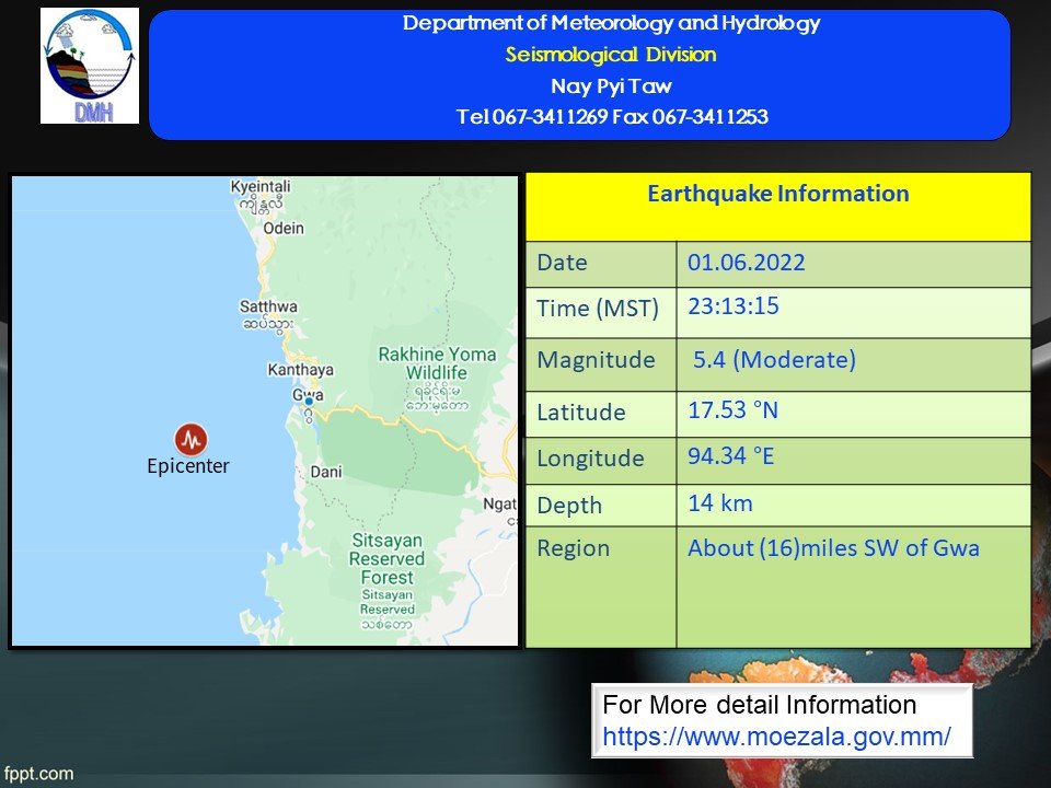 ၂၀၂၂ ခုနှစ်၊ ဇွန်လ (၁)ရက်နေ့၊ မြန်မာစံတော်ချိန် (၂၃)နာရီ၊ (၁၃)မိနစ်၊ (၁၅)စက္ကန့် အချိန်တွင် ဂွမြေငလျင်စခန်းမှ အနောက်တောင်ဘက် (၁၆)မိုင်ခန့်ကွာဝေးသော (မြန်မာ့ပင်လယ်ပြင်၊ ဂွမြို့၏ အနောက်တောင်ဘက် (၁၆)မိုင်ခန့်အကွာ) မြောက်လတ္တီတွဒ် (၁၇.၅၃) ဒီဂရီ၊ အရှေ့လောင်ဂျီတွဒ် (၉၄.၃၄)ဒီဂရီ၊ အနက် (၁၄)ကီလိုမီတာကို ဗဟိုပြု၍ အင်အား ရစ်(ခ်)တာစကေး (၅.၄)အဆင့်ရှိ အင်အားအသင့်အတင့်ရှိသော မြေငလျင်တစ်ခု လှုပ်ရှားသွားကြောင်း တိုင်းထွာရရှိပါသည်။