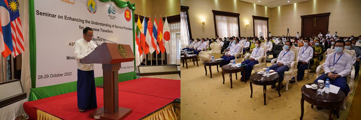 ဟိုတယ်နှင့် ခရီးသွားလာရေးဝန်ကြီးဌာနသည် အာဆီယံ-ဂျပန်ဗဟိုဌာန၏ အထောက်အပံ့ဖြင့် National Activity Project- 2022 ကို အကောင်အထည်ဖော်သည့်အနေဖြင့် ဂျပန်ခရီးသွား ဧည့်သည် များကို ဝန်ဆောင်မှုပေးနေသူများအတွက် အရည်အသွေးမြှင့်တင်ရေး အသိပညာပေးဆွေးနွေးပွဲကို အောက်တိုဘာ ၂၈ ရက်မှ ၂၉ ရက်အထိ နေပြည်တော်၊ ရွှေစံအိမ်ဟိုတယ်တွင် ကျင်းပပြုလုပ်ခဲ့ရာ အဆိုပါဆွေးနွေးပွဲ ဖွင့်ပွဲအခမ်းအနားသို့ ဟိုတယ်နှင့် ခရီးသွားလာရေးဝန်ကြီးဌာန၊ ပြည်ထောင်စု ဝန်ကြီး ဒေါက်တာဌေးအောင် တက်ရောက် အဖွင့်အမှာစကား ပြောကြားသည်။
