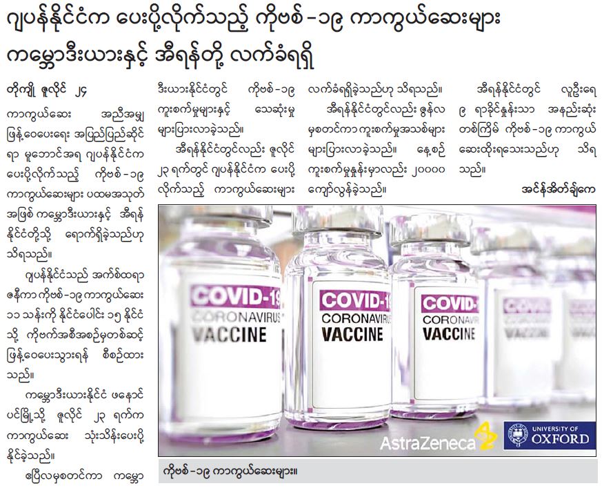 ဂျပန်နိုင်ငံက ပေးပို့လိုက်သည့် ကိုဗစ်-၁၉ ကာကွယ်ဆေးများ ကမ္ဘောဒီးယားနှင့် အီရန်တို့ လကခံရရှိ