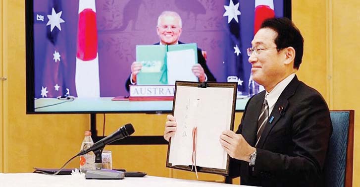 ဂျပန်နိုင်ငံအနေဖြင့် ယခုလို ကာကွယ်ရေးနှင့် လုံခြုံရေးပူးပေါင်းဆောင်ရွက်မှု သဘောတူစာချုပ်ကို လက်မှတ်ရေးထိုးရာတွင် သြစတြေးလျသည် ပထမဆုံးနိုင်ငံဖြစ်သည်။ ဂျပန်ဝန်ကြီးချုပ် ကီရှီးဒါး ဖူမီယိုသည် ဩစတြေးလျဝန်ကြီးချုပ် စကော့မောရစ်ဆင်နှင့် ဇန်နဝါရီ ၆ ရက် အွန်လိုင်း အစည်းအဝေးတွင် တွေ့ဆုံခဲ့သည်။
