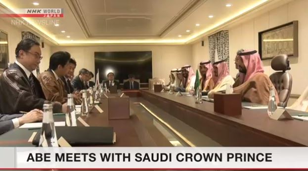 ဂျပန်ဝန်ကြီးချုပ် ရှင်ဇိုအာဘေး နှင့် ဆော်ဒီအာရေဗျ အိမ်ရှေ့မင်းသားတို့ နှစ်ဦးတွေ့ဆုံကာ အရှေ့အလယ်ပိုင်းဒေသ နိုင်ငံရေးတင်းမာမှုကို ဖြေလျော့ရန် နည်းလမ်းများကို ဆွေးနွေးခဲ့ကြသည်။