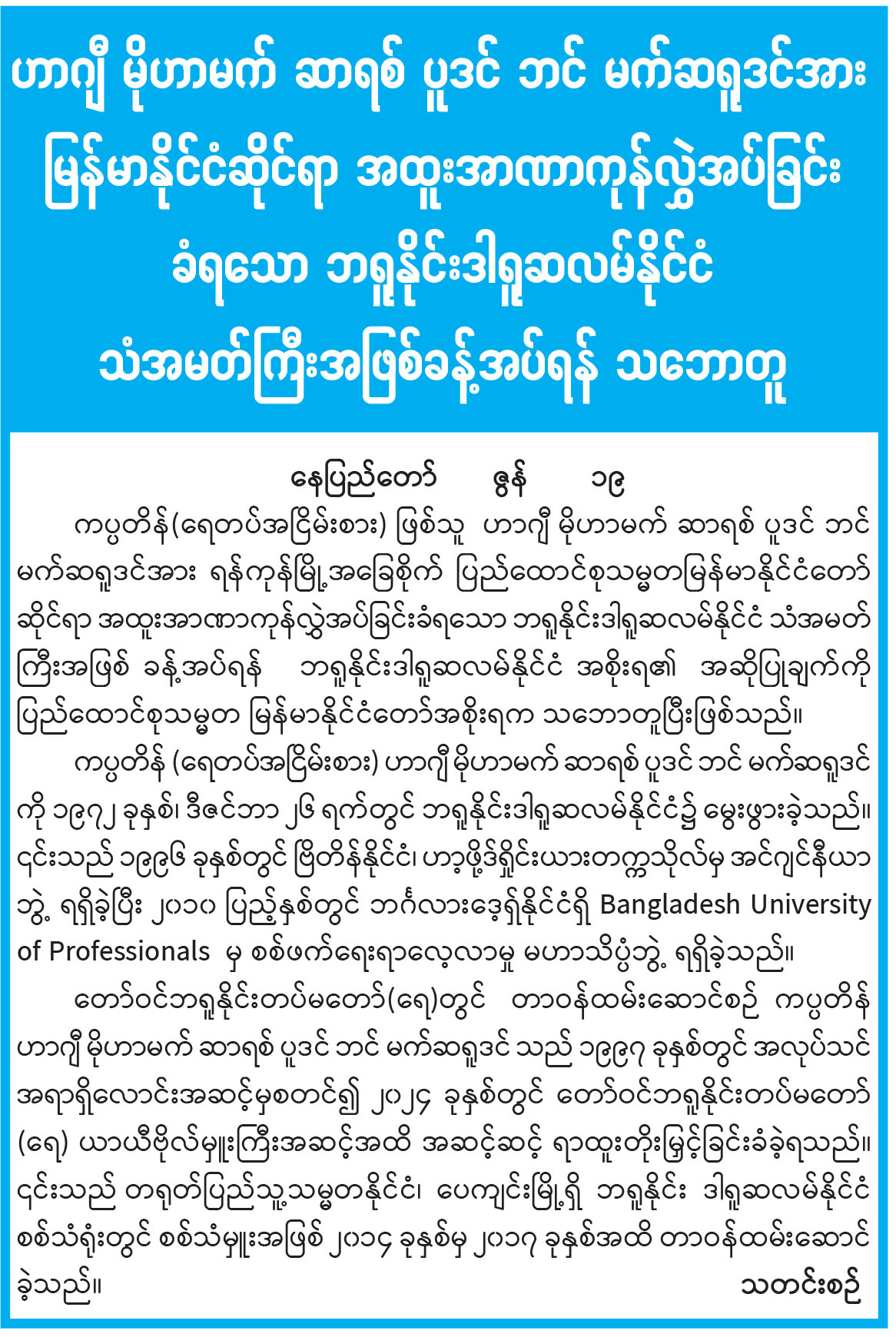 ဟာဂျီ မိုဟာမက် ဆာရစ် ပူဒင် ဘင် မက်ဆရူဒင်အား မြန်မာနိုင်ငံဆိုင်ရာ အထူးအာဏာကုန်လွှဲအပ်ခြင်း ခံရသော ဘရူနိုင်းဒါရူဆလမ်နိုင်ငံ သံအမတ်ကြီးအဖြစ်ခန့်အပ်ရန် သဘောတူ