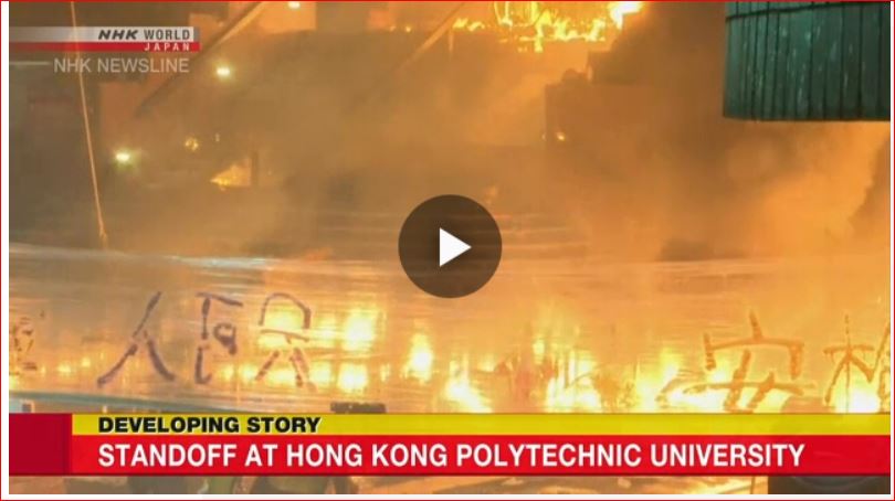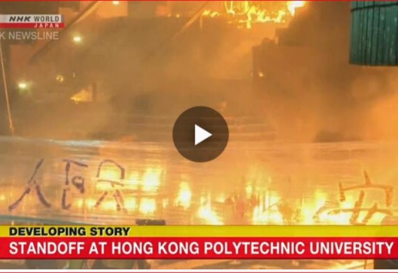ရဲများက မျက်ရည်ယိုဗုံးနှင့် ရေသေနတ်များ အသုံးပြုပြီး ဖြိုခွင်းသဖြင့် ဟောင်ကောင် ပိုလီ တက္ကနစ် တက္ကသိုလ်မှ ဆန္ဒပြသူများက ရဲတပ်ဖွဲ့ဝင်များ ဝင်ရောက်သည့် ဝင်ပေါက်တစ်ခုအား မီးရှို့မှု ဖြစ်ပွားခဲ့သည်။