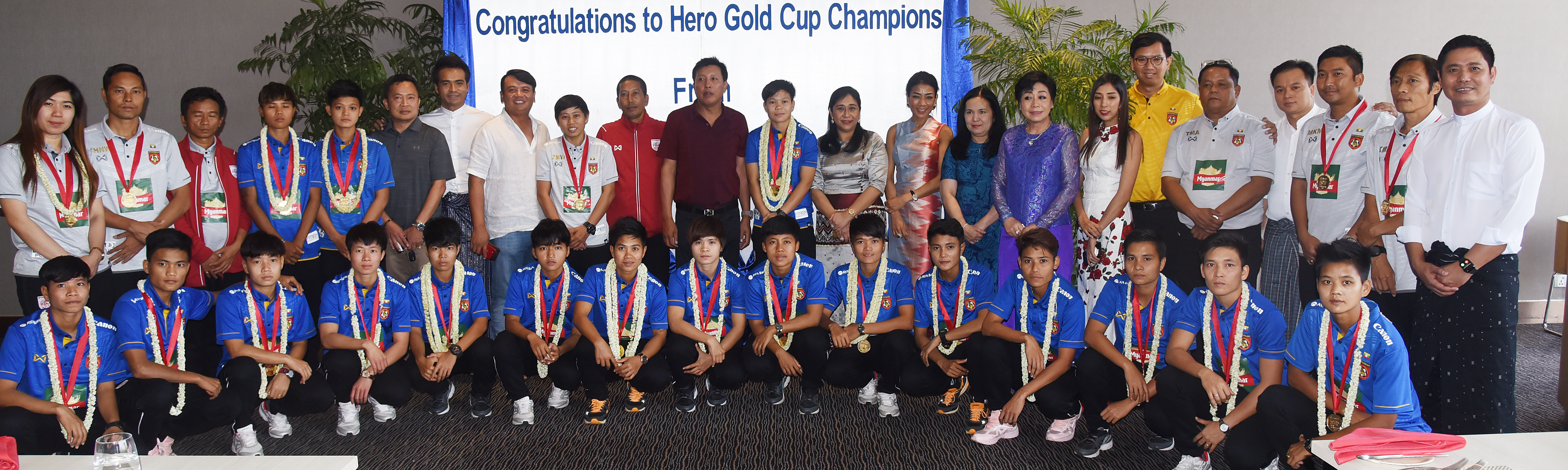 အိန္ဒိယဘောလုံးအဖွဲ့ချုပ်က ကြီးမှူး၍ ဖေဖော်ဝါရီ ၉ ရက်မှ ၁၅ ရက်အထိ ကျင်းပခဲ့သည့် ၂၀၁၉ Hero Gold Cup အိန္ဒိယဖိတ်ခေါ် အမျိုးသမီးဘောလုံးပြိုင်ပွဲတွင် ချန်ပီယံဆုရခဲ့သည့် အောင်ပွဲရ မြန်မာ့လက်ရွေးစင် အမျိုးသမီးအသင်းသည် ယနေ့နေ့လယ်ပိုင်းက ရန်ကုန်မြို့သို့ ပြန်လည်ရောက်ရှိလာရာ မြန်မာနိုင်ငံဘောလုံးအဖွဲ့ချုပ် အမျိုးသမီးဘောလုံးကော်မတီဥက္ကဋ္ဌ ဒေါ်ခင်စံပယ်ကြည်၊ ဒုဥက္ကဋ္ဌ ဒေါ်ဌေးဌေးခိုင်၊ မြန်မာနိုင်ငံဘောလုံးအဖွဲ့ချုပ် အမှုဆောင်အရာရှိချုပ် ဦးဘုန်းနိုင်ဇော်၊ အထွေထွေအတွင်းရေးမှူး ဦးကိုကိုသိန်းနှင့် အမှုဆောင်များ၊ သက်တမ်းအလိုက် လူငယ်လက်ရွေးစင်အသင်းများမှ နည်းပြများနှင့် ကစားသမားများ၊ ဆွေမျိုးမိတ်သင်္ဂဟများက ရန်ကုန်အပြည်ပြည်ဆိုင်ရာလေဆိပ်တွင် ကြိုဆိုနှုတ်ဆက်ကြသည်။