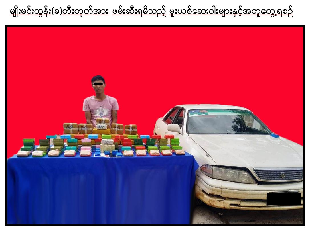 မူးယစ်ဆေးဝါးတားဆီးနှိမ်နင်းရေးရဲတပ်ဖွဲ့မှ တပ်ဖွဲ့ဝင်များသည် ဇွန် ၁၁ ရက် မွန်းလွဲ ၂ နာရီ ခွဲက ဟိုပုံးမြို့နယ်၊ လွယ်အွန့်ကျေးရွာအုပ်စု၊ ရန်ကင်းကျေးရွာအနီး၊ ဟိုပုံး-တောင်ကြီးသွားကားလမ်းတွင် မျိုးမင်းထွန်း မောင်းနှင်လာသော TOYOTA MARK II အမျိုးအစားမော်တော်ယာဉ်ကို ရပ်တန့် ရှာဖွေရာ ငွေကျပ် ၁၅၀၅ ဒသမ ၂ တန်ဖိုးရှိ စိတ်ကြွရူးသွပ်ဆေးပြား ၁၃၆,၀၀၀ ၊ ဘိန်းဖြူ သုည ဒသမ ၉၆၈ ကီလို၊ လက်ကိုင်ဖုန်းတစ်လုံးတို့ကို သိမ်းဆည်းရမိခဲ့သည်။