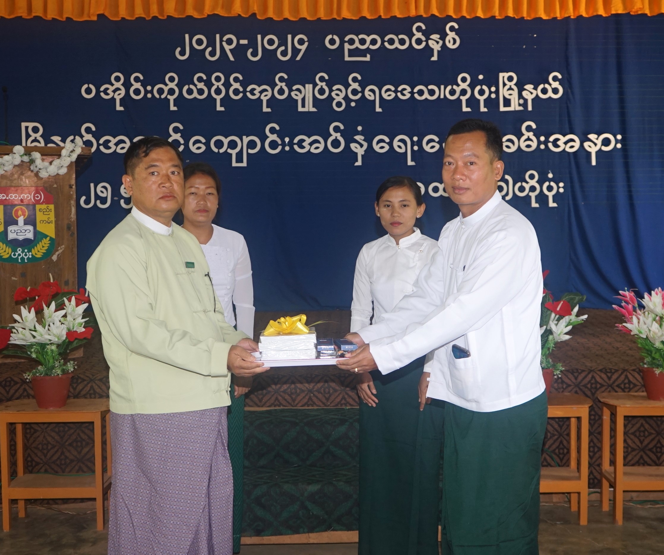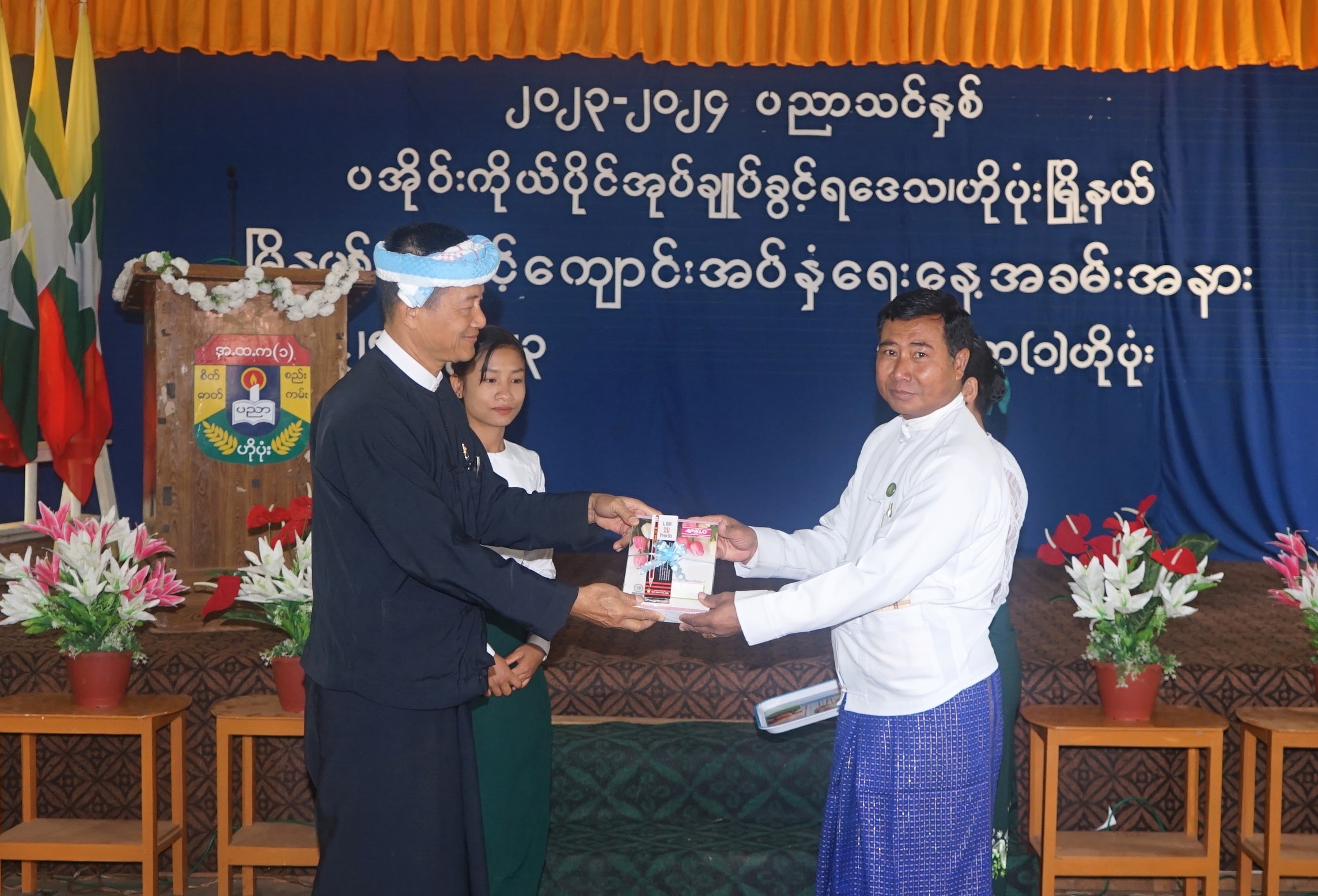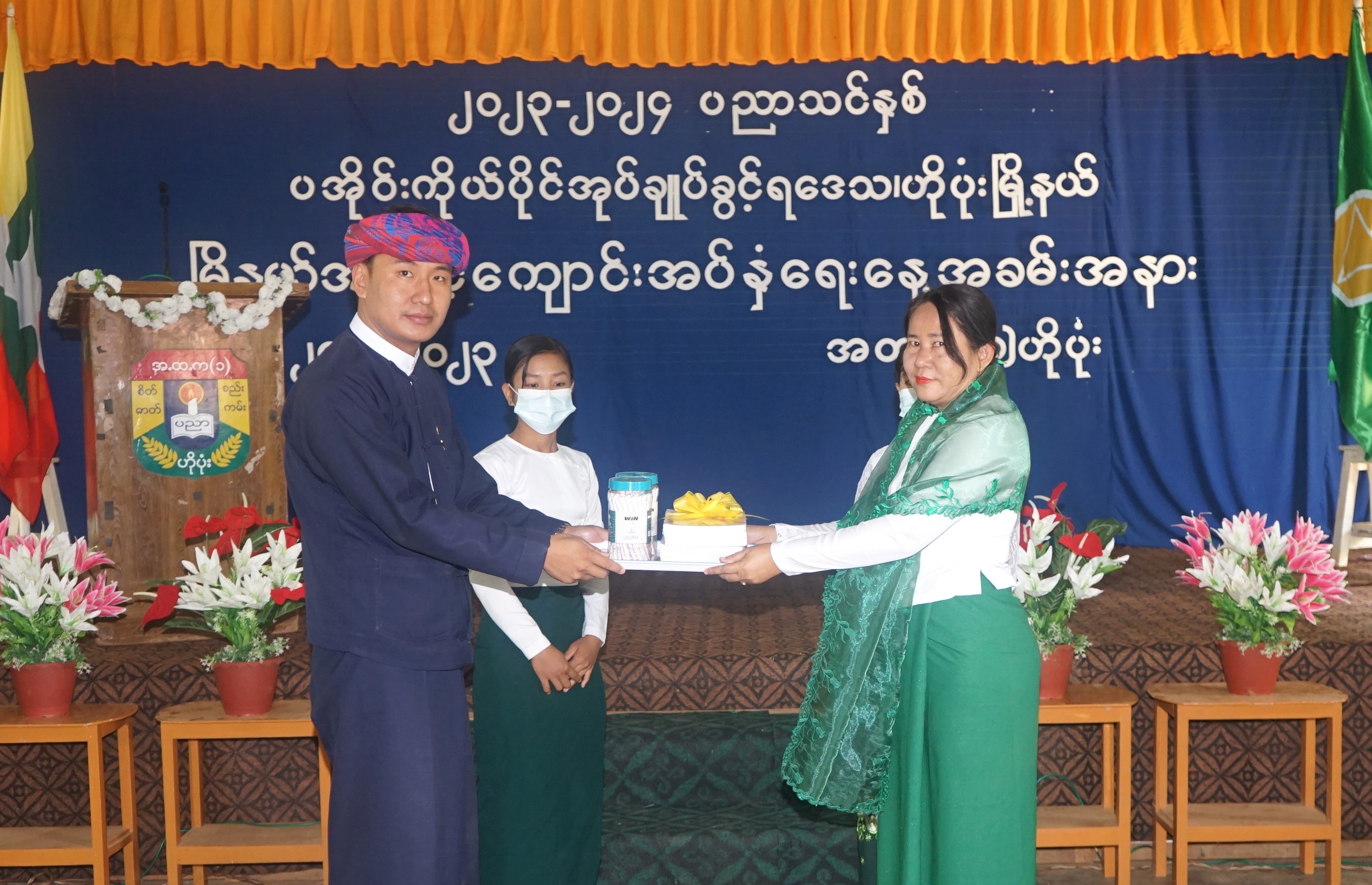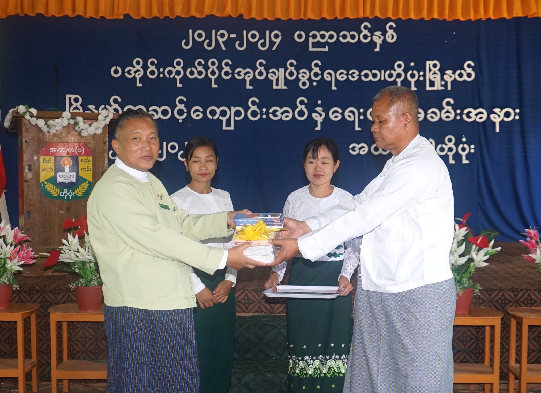 ထို့နောက် ပအိုဝ်းကိုယ်ပိုင်အုပ်ချုပ်ခွင့်ရဒေသ စီမံအုပ်ချုပ်ရေးအဖွဲ့ ဥက္ကဋ္ဌက အမှာစကားပြောကြားပြီး ပအိုဝ်းကိုယ်ပိုင်အုပ်ချုပ်ခွင့်ရဒေသ စီမံအုပ်ချုပ်ရေးအဖွဲ့ ဥက္ကဋ္ဌ ဦးခွန်ရဲထွေးနှင့် တာဝန်ရှိသူများ၊ အလှူရှင်များက ဗလာစာအုပ်၊ ခဲတံ၊ ဘောပင်စသည့် ထောက်ပံ့ပစ္စည်းများကို ပေးအပ်ရာ တာဝန်ရှိသူများက လက်ခံရယူသည်။ ထို့နောက် ကျောင်းသား မိဘများက ကျောင်းအပ်နှံမှုကို လှည့်လည်ကြည့်ရှုအားပေးသည်။