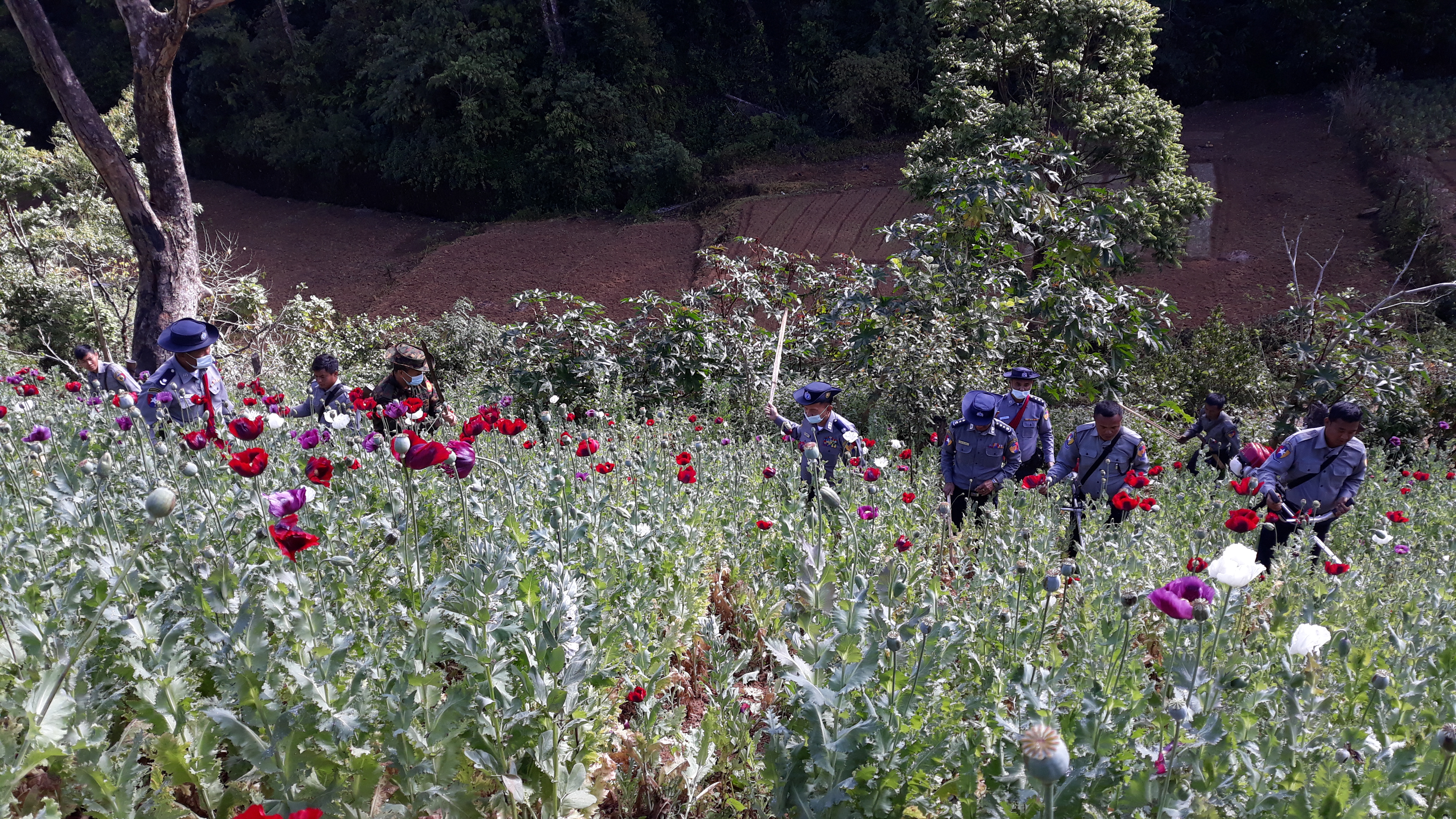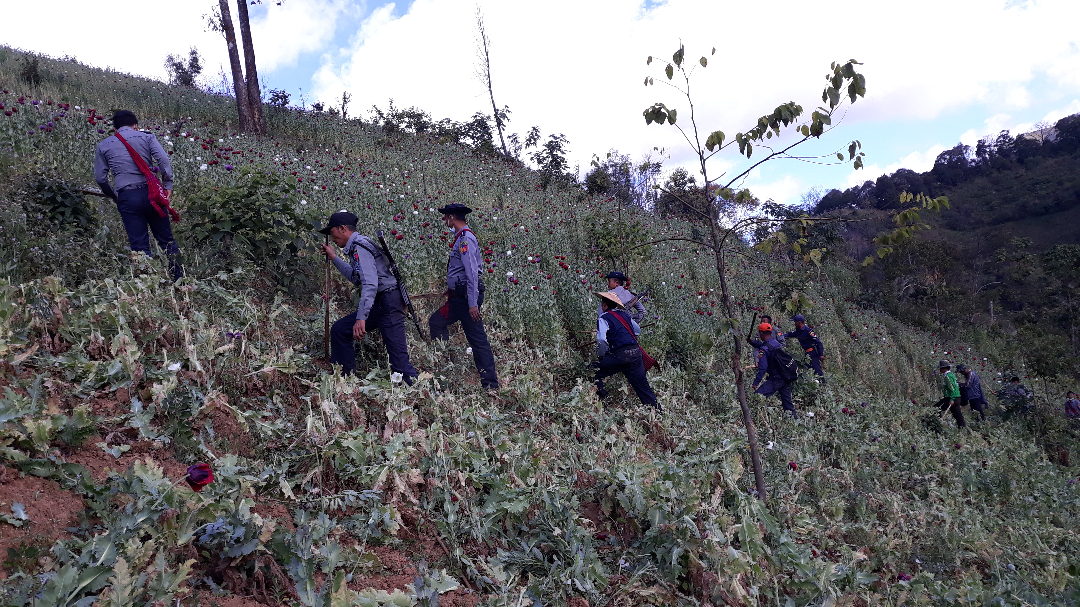 ရှမ်းပြည်နယ် ရဲတပ်ဖွဲ့မှူး ရဲမှူးချုပ် တင်ကိုကိုနှင့် တပ်ဖွဲ့ဝင်များ၊ ပအိုဝ်းကိုယ်ပိုင်အုပ်ချုပ်ခွင့်ရဒေသ ဦးစီးအဖွဲ့ အဖွဲ့ဝင် ဒုတိယဗိုလ်မှူးကြီး ညီညီတင်၊ ရှမ်းပြည်နယ် ဒုတိယပြည်နယ် ရဲတပ်ဖွဲ့မှူး ရဲမှူးကြီး ဇော်မင်းအောင်နှင့် တပ်ဖွဲ့ဝင်များ၊ ဟိုပုံးမြို့တပ်နယ်မှ ဗိုလ်ကြီးဇေယျာဝင်းနှင့် တပ်ဖွဲ့ဝင်များ၊ ဟိုပုံးမြို့နယ်ရဲတပ်ဖွဲ့မှူး ရဲမှူး လှိုင်ထွေးနှင့် တပ်ဖွဲ့ဝင်များ၊ မူးယစ်တပ်ဖွဲ့စု (၂၅) တောင်ကြီးမှ ရဲတပ်ကြပ်ကြီး ကျော်မြင့်အောင်တို့ပါဝင်သော ပူးပေါင်းဘိန်းဖျက်ဆီးရေးအဖွဲ့၊ မြိုနယ်အထွေထွေအုပ်ချုပ်ရေးဦးစီးဌာနမှ စာရေးဝန်ထမ်းများ၊ မြို့နယ် မီးသတ်ဦးစီးဌာနမှ ဝန်ထမ်းများ၊ မြို့နယ်လယ်ယာမြေ စီမံခန့်ခွဲမှုနှင့် မြေစာရင်းဦးစီးဌာနမှ ဝန်ထမ်းများ၊ မြို့နယ်သစ်တောဦးစီးဌာနမှ ဝန်ထမ်းများ၊ မြို့နယ်စိုက်ပျိုးရေးဦးစီးဌာနမှ ဝန်ထမ်းများ စုစုပေါင်း အင်အား ၆၇ ဦးဖြင့် ဘိန်းစိုက်ခင်း ၃၂ ဧကကို သွားရောက်ဖျက်ဆီးခဲ့ကြကြောင်းသိရသည်။