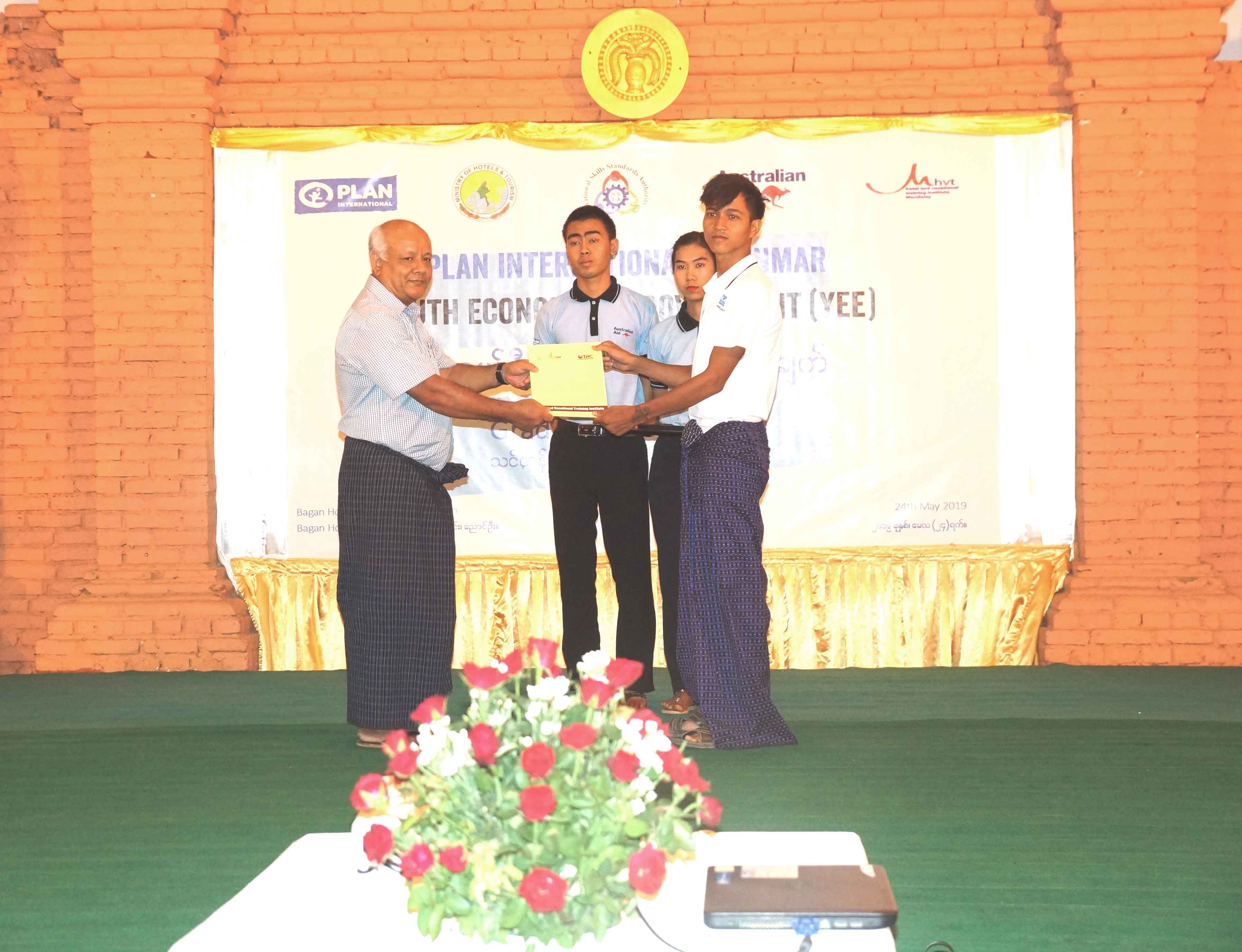 အခမ်းအနားတွင် လူငယ်စီးပွားမြှင့်တင်ရေးစီမံချက် အကြံပေးဘုတ်အဖွဲ့ဥက္ကဋ္ဌ ဦးဇော်ဝိတ်မှ Plan International Myanmar အဖွဲ့၏ လုပ်ဆောင်ချက်များကို ရှင်းလင်းရာတွင် PIM အနေဖြင့် တိုင်းပြည်၏ အနာဂတ် ခေါင်းဆောင်လောင်းများဖြစ်သည့် ကလေးသူငယ်များ၏ အခွင့်အရေးနှင့် လူမှုစီးပွားဘဝ တိုးတက်ရေးလုပ်ငန်းများကို အဓိကဦးစားပေးလုပ်ဆောင်လျက်ရှိကြောင်း၊ လူငယ်စီးပွား ဖွံ့ဖြိုးရေးစီမံချက်ဖြင့် သင်တန်းများပို့ချလျက်ရှိရာ သင်တန်းအပတ်စဉ်ပေါင်း ရှစ်ခုကို အောင်မြင်စွာ လေ့ကျင့်သင်ကြား မွေးထုတ်ပေးခဲ့ပြီးဖြစ်ပါကြောင်း၊ မိမိတို့နိုင်ငံ၏ ဟိုတယ်နှင့်ခရီးသွားလာရေးကဏ္ဍဖွံ့ဖြိုးတိုးတက်အောင် ကြိုးပမ်းရာတွင် သင်တန်းဆင်းလူငယ်မောင်မယ်များအနေဖြင့် တတ်စွမ်းသလောက် ပူးပေါင်းပါဝင်ဆောင်ရွက်ကြစေလိုပါကြောင်း ပြောကြားသည်။