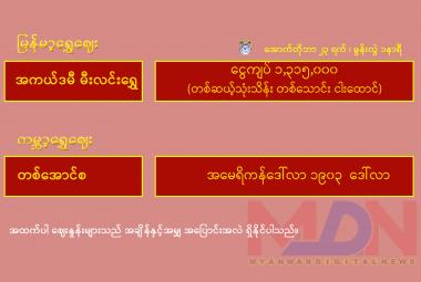 Home Dec 30,2025 |01:08 | စီးပွားရေး ၂၀၂၅ ခုနှစ်တွင် ဆူဒန်နိုင်ငံ၏ ရွှေထုတ်လုပ်မှု တန်ချိန် ၇၀ အထိ ရောက်ရှိ Dec 30,2025 |11:05 | အားကစား အီတလီစီးရီးအေတွင် အင်တာမီလန် အမှတ်ပေးဇယားကို ပြန်လည်ဦးဆောင် Dec 30,2025 |10:53 | အားကစား အာဆီယံ ယူ-၁၆ ဖူဆယ်ချန်ပီယံရှစ်ပြိုင်ပွဲတွင် မြန်မာအသင်း ဗီယက်နမ်ကို ရှုံးကြွေးပြန်ဆပ်ပြီး တတိယဆုရရှိ Dec 30,2025 |10:25 | ပြည်တွင်း ဒီဇင်ဘာ ခရစ္စမတ်ရုံးပိတ်ရက်ကာလအတွင်း တောင်ကြီး-ပေါမူ၊ ပေါမူ-တောင်ကြီး ရှုခင်းကြည့် Sight Seeing ရထားခရီးစဉ် ခရီးသည်စီးနင်းမှုများပြား Dec 30,2025 |09:43 | ပြည်တွင်း ပြည်ထောင်စုသမ္မတ မြန်မာနိုင်ငံတော် ယာယီသမ္မတ နိုင်ငံတော်လုံခြုံရေးနှင့် အေးချမ်းသာယာရေး ကော်မရှင်ဥက္ကဋ္ဌ ဗိုလ်ချုပ်မှူးကြီးမင်းအောင်လှိုင်ထံ ရုရှားဖက်ဒရေးရှင်းနိုင်ငံ ဒူးမားလွှတ်တော် ဒုတိယဥက္ကဋ္ဌ ဦးဆောင်သည့် ကိုယ်စားလှယ်အဖွဲ့က လာရောက်ဂါရဝပြုတွေ့ဆုံ Dec 29,2025 |03:28 | အားကစား နိုင်ဂျီးရီးယားက တူနီးရှားကို အနိုင်ယူပြီး အာဖရိကနိုင်ငံများဖလား ၁၆ သင်းအဆင့်တက် Dec 29,2025 |03:25 | အားကစား ဩစတြေးလျအိုးပင်းပြိုင်ပွဲကို ဒဏ်ရာကြောင့် ဒရေပါ လွဲချော်ဖွယ်ရှိ Dec 29,2025 |02:00 | အားကစား အက်စ်တွန်ဗီလာက ချယ်ဆီးကို အနိုင်ယူပြီး ပြိုင်ပွဲစုံ ၁၁ ပွဲဆက် နိုင်ပွဲရရှိလာ Dec 29,2025 |11:12 | နိုင်ငံတကာ ကာဂျစ္စတန်နိုင်ငံ၌ အမှိုက်မှ လျှပ်စစ်ဓာတ်အားထုတ်လွှတ်ရေးစက်ရုံ စတင်ဖွင့်လှစ် Dec 29,2025 |11:07 | နိုင်ငံတကာ အိန္ဒိယနိုင်ငံမြို့တော် နယူးဒေလီ၌ နှစ်သစ်ကူးကာလအတွင်း ရာဇ၀တ်မှုများအား တားဆီးနှိမ်နင်း Dec 29,2025 |11:04 | နိုင်ငံတကာ ဗင်နီဇွဲလားသမ္မတ နီကိုးလပ်စ်မာဒူရိုက အမေရိကန်သမ္မတနှင့် တွေ့ဆုံဆွေးနွေးရန် ဆန္ဒရှိ Dec 29,2025 |10:49 | ပြည်တွင်း ၂၀၂၅ ခုနှစ် ပါတီစုံဒီမိုကရေစီ အထွေထွေရွေးကောက်ပွဲကျင်းပနေမှု နိုင်ငံတကာနှင့် ပြည်တွင်းအခြေစိုက် နိုင်ငံခြားသံရုံးများမှ ရွေးကောက်ပွဲစောင့်ကြည့်လေ့လာသူများ လှည့်လည်ကြည့်ရှုလေ့လာ Dec 29,2025 |10:44 | တွေ့ဆုံ မေးမြန်းခန်း ပြည်သူတွေက အခုလို စိတ်အားထက်သန်စွာ မဲပေးနေတာ နိုင်ငံကို ပိုမိုကောင်းမွန်စေလိုတဲ့ စိတ်ဆန္ဒရှိတယ်ဆိုတာ တွေ့ရပါတယ် Dec 29,2025 |10:43 | အားကစား မြန်မာအမျိုးသမီးလိဂ်တွင် ရှမ်းယူနိုက်တက်အသင်း နိုင်ပွဲဆက် Dec 29,2025 |10:43 | ပြည်တွင်း ပြည်ထောင်စုသမ္မတမြန်မာနိုင်ငံတော် နိုင်ငံတော်ယာယီသမ္မတ နိုင်ငံတော်လုံခြုံရေးနှင့် အေးချမ်းသာယာရေးကော်မရှင် ဥက္ကဋ္ဌ ဗိုလ်ချုပ်မှူးကြီး မင်းအောင်လှိုင် နေပြည်တော်ဘူတာကြီးသို့ သွားရောက်ကြည့်ရှုစစ်ဆေး ၂၀၂၅ ခုနှစ် ပါတီစုံဒီမိုကရေစီ အထွေထွေရွေးကောက်ပွဲ ကျင်းပရန် 00 Days 00 Hours 00 Minutes 00 Seconds နောက်ဆုံးရသတင်းများ ဂျပန်နိုင်ငံ၌ ၂၀၂၅ ခုနှစ် ဧပြီလမှ အောက်တိုဘာလအထိ ဖမ်းဆီးရမိသောဝက်ဝံအရေအတွက်စံချိန်တင်များပြား Dec 30 ၂၀၂၅ ခုနှစ်တွင် ဆူဒ