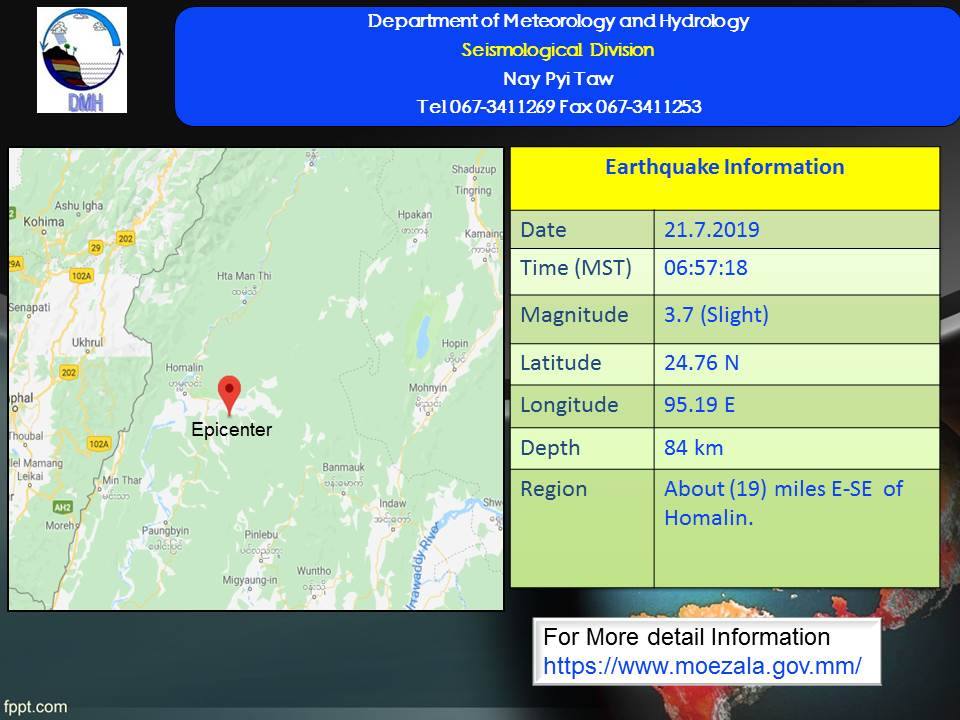 ဇူလှိုင် (၂၁) ရက် မြန်မာစံတော်ချိန် (ဝ၆) နာရီ၊ (၅၇) မိနစ်၊ (၁၈) စက္ကန့် တွင် တမူးမြေငလျင်စခန်းမှ အရှေ့မြောက်ဘက် (၆၇) မိုင် ခန့်ကွာဝေးသော မြန်မာနိုင်ငံပြည်တွင်း၊ ဟုမ္မလင်းမြို့၏ အရှေ့-အရှေ့တောင်ဘက် (၁၉)မိုင်ခန့်အကွာ တွင် မြေငလျင်တစ်ခု လှုပ်ရှားသွားကြောင်း မိုးလေဝသနှင့် ဇလဗေဒညွှန်ကြားမှု ဦးစီးဌာနမှ ထုတ်ပြန်ချက်အရ သိရသည်။