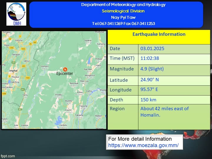 ယနေ့ နံနက် ၁၁ နာရီ ၂ မိနစ်ခန့်က တမူးမြေငလျင်စခန်းမှ အရှေ့မြောက်ဘက် (၉၂)မိုင်ခန့်ကွာ၊ ဟုမ္မလင်းမြို့၏ အရှေ့ဘက် (၄၂)မိုင်ခန့်အကွာကို ဗဟိုပြု၍ အင်အား ရစ်(ခ်)တာစကေး ၄ ဒသမ ၉ အဆင့်ရှိ အင်အားအနည်းငယ်ရှိသော မြေငလျင်တစ်ခု လှုပ်ရှားသွားကြောင်း သိရှိရသည်။