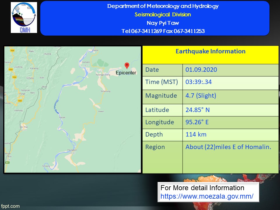 ၂၀၂၀ ပြည့်နှစ်၊ စက်တင်ဘာလ ( ၁ )ရက် မြန်မာစံတော်ချိန် ( ၀၃ ) နာရီ၊ ( ၃၉ )မိနစ်တွင် တမူးမြေငလျင်စခန်းမှ အရှေ့မြောက်ဘက် ( ၇၅ ) မိုင် ခန့်ကွာဝေးသော မြန်မာနိုင်ငံပြည်တွင်း ဟုမ္မလင်းမြို့၏ အရှေ့ဘက် ( ၂၂ )မိုင် ခန့်အကွာ မြောက်လတ္တီတွဒ် ( ၂၄ ဒသမ ၈၅ ) ဒီဂရီ၊ အရှေ့လောင်ဂျီတွဒ် ( ၉၅ ဒသမ ၂၆ ) ဒီဂရီ၊ အနက် ( ၁၁၄ ) ကီလိုမီတာကို ဗဟိုပြု၍ အင်အား ရစ်(ခ်)တာစကေး ( ၄ ဒသမ ၇ )အဆင့်ရှိ အင်အားအနည်းငယ်ရှိသော မြေငလျင်တစ်ခု လှုပ်ရှားသွားကြောင်း တိုင်းထွာရရှိပါသည်။