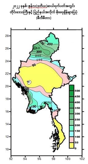 မိုးရွာရက်အနေဖြင့် စစ်ကိုင်းတိုင်းဒေသကြီးအထက်ပိုင်း၊ ပဲခူးတိုင်းဒေသကြီး၊ ရန်ကုန်တိုင်းဒေသကြီး၊ ဧရာဝတီတိုင်းဒေသကြီး၊ တနင်္သာရီတိုင်းဒေသကြီး၊ ကချင်ပြည်နယ်၊ ချင်းပြည်နယ်၊ ရှမ်းပြည်နယ် (အရှေ့ပိုင်းနှင့် တောင်ပိုင်း၊ ရခိုင်ပြည်နယ်၊ ကရင်ပြည်နယ်နှင့် မွန်ပြည်နယ်တို့တွင် (၇)ရက်မှ (၉)ရက်ခန့်နှင့် နေပြည်တော်၊ စစ်ကိုင်းတိုင်းဒေသကြီးအောက်ပိုင်း၊ မန္တလေးတိုင်းဒေသကြီး၊ မကွေးတိုင်း ဒေသကြီး၊ ရှမ်းပြည်နယ်မြောက်ပိုင်းနှင့် ကယားပြည်နယ်တို့တွင် (၄)ရက်မှ (၆)ရက်ခန့် မိုးထစ်ချုန်းရွာနိုင်ပါသည်။