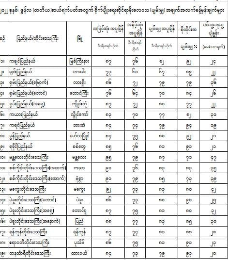 ၂၀၂၂ ခုနှစ်၊ ဇွန်လ (ဒုတိယ)ဆယ်ရက်ပတ်အတွင်း မိုးရွာသွန်းမှုအခြေအနေများမှာ- မန္တလေးတိုင်း ဒေသကြီး၊ ပဲခူးတိုင်းဒေသကြီးအရှေ့ပိုင်းနှင့် ရှမ်းပြည်နယ်အရှေ့ပိုင်းတို့တွင် ဇွန်လ(ဒုတိယ) ဆယ်ရက်ပတ်၏ ပျမ်းမျှမိုးရေချိန် ခန့်သာရှိခဲ့ပြီး စစ်ကိုင်းတိုင်းဒေသကြီးအောက်ပိုင်း၊ ပဲခူးတိုင်းဒေသကြီးအနောက်ပိုင်းနှင့် ကချင်ပြည်နယ်တို့တွင် ဇွန်လ (ဒုတိယ)ဆယ်ရက်ပတ်၏ ပျမ်းမျှမိုးရေချိန်တို့ထက် ပိုခဲ့ကာ စစ်ကိုင်းတိုင်းဒေသကြီးအထက်ပိုင်း၊ မကွေးတိုင်းဒေသကြီး၊ ပဲခူးတိုင်းဒေသကြီးတောင်ပိုင်း၊ ရန်ကုန်တိုင်းဒေသကြီး၊ ဧရာဝတီတိုင်းဒေသကြီး၊ တနင်္သာရီတိုင်း ဒေသကြီး၊ ချင်းပြည်နယ်၊ ရှမ်းပြည်နယ်(မြောက်ပိုင်းနှင့်တောင်ပိုင်း)၊ ရခိုင်ပြည်နယ်၊ ကယားပြည်နယ်၊ ကရင်ပြည်နယ်နှင့် မွန်ပြည်နယ်တို့တွင် ဇွန်လ(ဒုတိယ) ဆယ်ရက်ပတ်၏ ပျမ်းမျှမိုးရေချိန်တို့အောက် လျော့နည်းခဲ့ပါသည်။