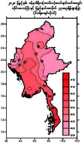 လေထုအတွင်းရေငွေ့ပါဝင်မှုအခြေအနေ ----- ၂၀၂၀ ပြည့်နှစ်၊ ဇန်နဝါရီလ(တတိယ) ဆယ်ရက်ပတ်အတွင်း (လေထုစိုထိုင်းဆ) အခြေအနေများမှာ - ရှမ်းပြည်နယ်(တောင်ပိုင်း)တွင် (၄၆%)၊ ချင်းပြည်နယ်တွင် (၅၇%)၊ မန္တလေးတိုင်းဒေသကြီး၊ မကွေးတိုင်းဒေသကြီး၊ ပဲခူးတိုင်းဒေသကြီး (တောင်ပိုင်း)၊ ရန်ကုန်တိုင်းဒေသကြီး၊ ကရင်ပြည်နယ်နှင့် မွန်ပြည်နယ်တို့တွင် (၆၇%)မှ (၇၁%) အတွင်းနှင့် စစ်ကိုင်းတိုင်းဒေသကြီး၊ ပဲခူးတိုင်းဒေသကြီး(အရှေ့ပိုင်းနှင့်အနောက်ပိုင်း)၊ ဧရာဝတီတိုင်းဒေသကြီး၊ တနင်္သာရီတိုင်းဒေသကြီး၊ ကချင်ပြည်နယ်၊ ရှမ်းပြည်နယ် (အရှေ့ပိုင်းနှင့်မြောက်ပိုင်း)၊ ရခိုင်ပြည်နယ်နှင့် ကယားပြည်နယ်တို့တွင် (၇၂%)မှ (၇၉%)အတွင်း အသီးသီးရှိခဲ့ပါသည်။