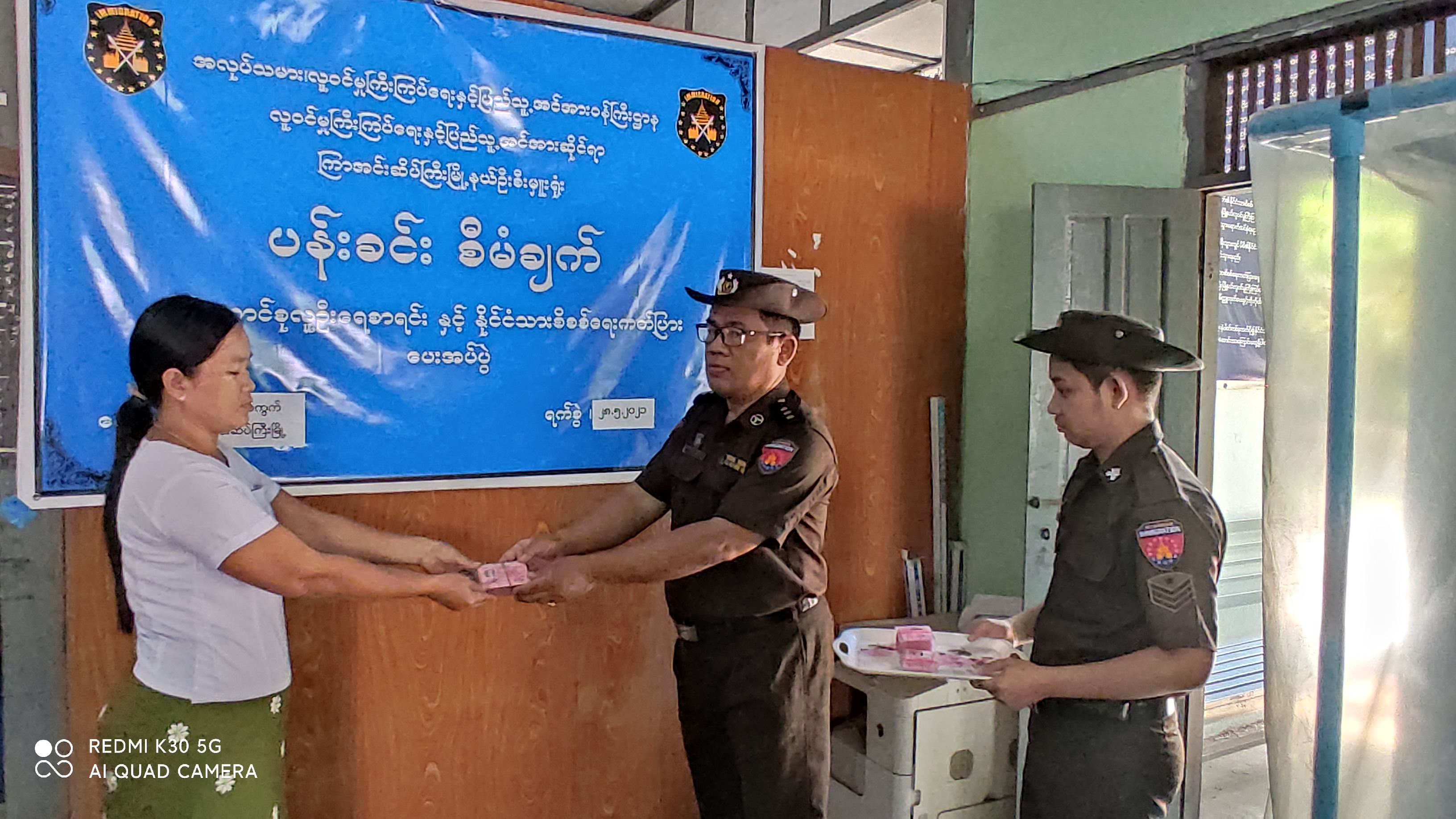 ပန်းခင်းစီမံချက်ဖြင့် ကွင်းဆင်းဆောင်ရွက်ပေးလျက်ရှိရာ အိမ်ထောင်စုဇယားမရှိသေးသည့် အိမ်ထောင်စုများ နိုင်ငံသားစိစစ်ရေးကတ်ပြား မရှိသေးသည့် ဒေသခံပြည်သူများ အခမဲ့ကွင်းဆင်းပြုလုပ်ပေးခဲ့ရာ မေ ၃၁ ရက်တွင် အမှတ်(၆)ရပ်ကွက် အုပ်ချုပ်ရေးမှူးရုံး၌ အိမ်ထောင်စုလူဦးရေစာရင်းနှင့် နိုင်ငံသားစိစစ်ရေးကတ်ပြားများ ပေးအပ်ခဲ့ကြောင်း သိရသည်။
