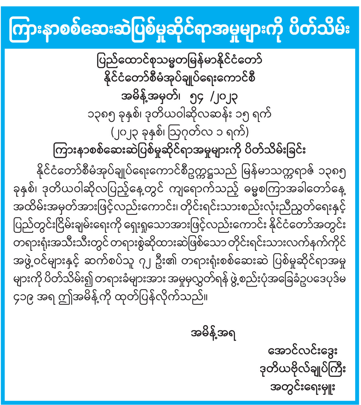 ကြားနာစစ်ဆေးဆဲပြစ်မှုဆိုင်ရာအမှုများကို ပိတ်သိမ်း