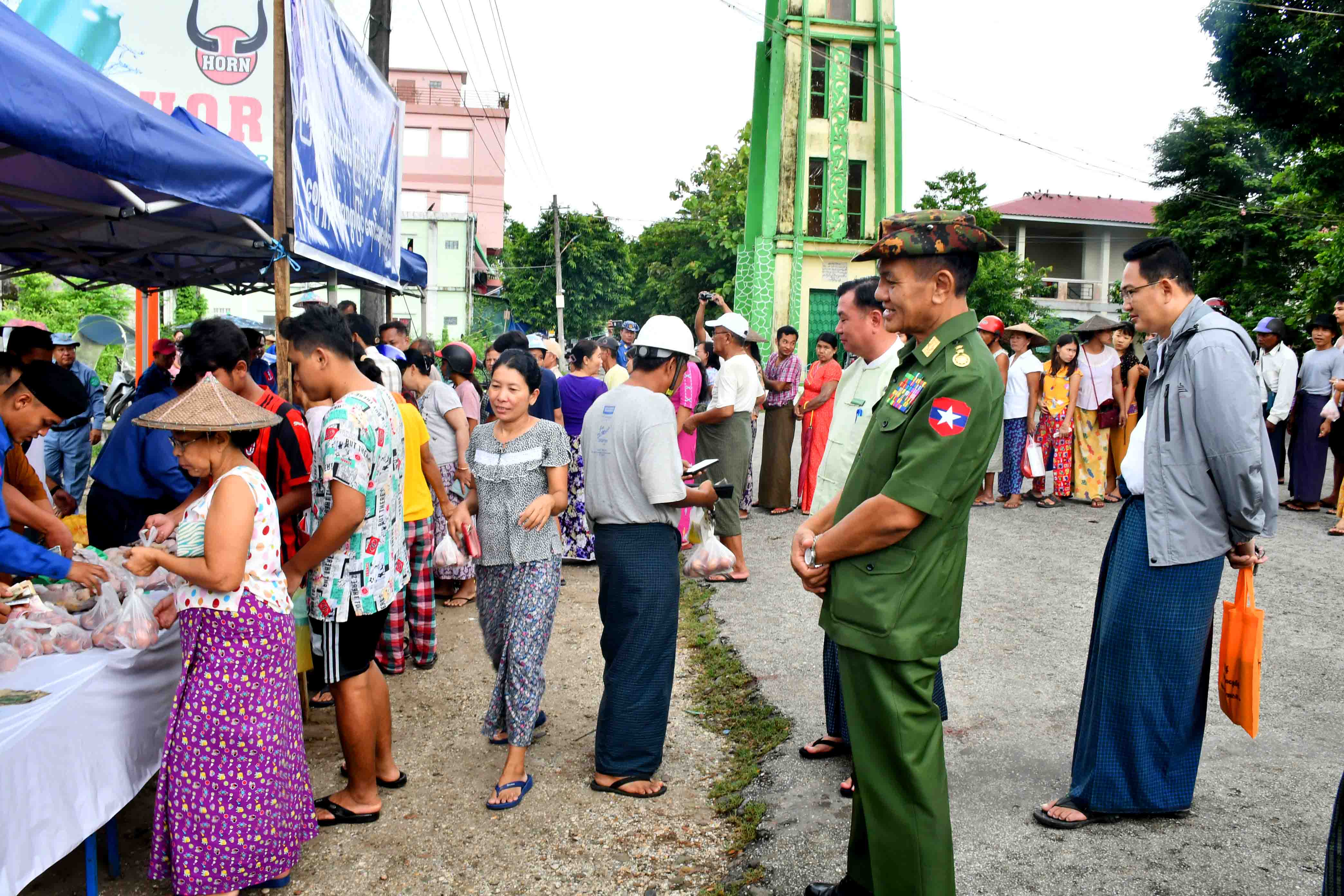 ဒုတိယဗိုလ်ချုပ်ကြီးလူအေးနှင့် တာဝန်ရှိသူများက ခရိုင်/မြို့နယ် သဘာဝဘေးအန္တရာယ်စီမံခန့်ခွဲမှု ကော်မတီဝင်များနှင့်အတူ ကျောက်ဖြူမြို့၊ အလယ်ပိုင်းရပ်ကွက်၊ နာရီစင်ကွင်း၌ ဓညဝတီရေတပ်စခန်းဌာနချုပ်မှ မြို့ပေါ်ရပ်ကွက်များရှိ  ဒေသခံပြည်သူများအား ဝက်သား၊ ကြက်သား၊ ဘဲသားနှင့် ကြက်ဥများကို  ပြင်ပပေါက်ဈေးထက် ဈေးနှုန်းသက်သာစွာဖြင့် ရောင်းချပေးနေမှုကို ကြည့်ရှုအားပေးသည်။