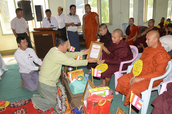 ယင်းနောက် မြို့နယ်အုပ်ချုပ်ရေးမှူး၊ မြို့နယ်သာသနာရေးမှူးနှင့် တာဝန်ရှိသူများက အောင်လက်မှတ်နှင့် လှူဘွယ်ဝတ္ထုပစ္စည်းများကို ဆက်ကပ်ပူဇော်ကြပြီး၊ အခမ်းအနားကို ဗုဒ္ဓသာသနံ စိရံတိဌတု သုံးကြိမ်ရွတ်ဆိုဆုတောင်းကာရုပ်သိမ်းခဲ့ကြောင်း သိရသည်။