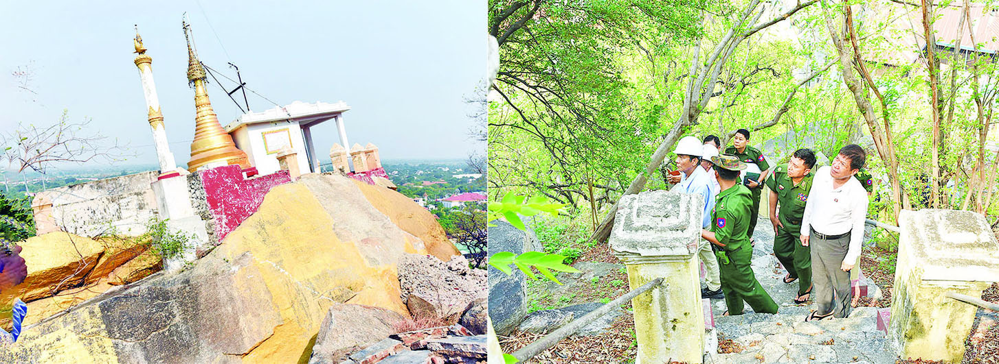 မန္တလေးတိုင်းဒေသကြီးဝန်ကြီးချုပ် ဦးမျိုးအောင်၊ ကာကွယ်ရေးဦးစီးချုပ်ရုံး(ကြည်း)မှ ဒုတိယဗိုလ်ချုပ်ကြီး မျိုးသန့်နိုင်၊ ဘူမိဗေဒပညာရှင် ဒေါက်တာယုမောင်နှင့်အဖွဲ့၊ တာဝန်ရှိသူများသည် မန္တလေးငလျင်ကြီးကြောင့် ကျောက်ဆည်မြို့ ရွှေသာလျောင်းတောင်တော်ရှိ ကျောက်သေတ္တာကြီး မူလအခြေအနေမှ တိမ်းစောင်းသွားခဲ့ရာ လက်ရှိအတိုင်း ခိုင်ခံ့စေရေးနှင့် ဘေးပတ်ဝန်းကျင်အန္တရာယ်မဖြစ်ပေါ်စေရေး ထိန်းသိမ်းဆောင်ရွက်မည့် နည်းလမ်းများအတွက် ယနေ့ နံနက်ပိုင်းက သွားရောက်၍ အနီးကပ်ကြည့်ရှုစစ်ဆေးကြသည်။
