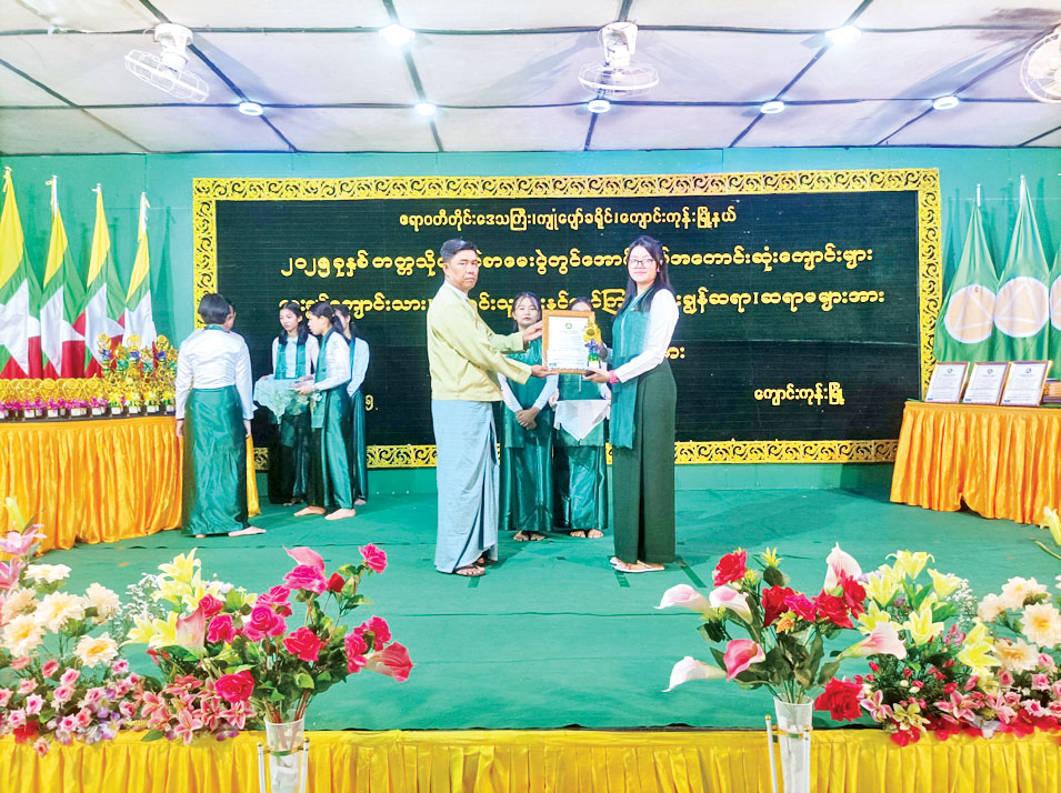 ထို့နောက် ဆုချီးမြှင့်ပွဲကျင်းပရာ မြို့နယ်စီမံခန့်ခွဲရေးနှင့် အုပ်ချုပ်ရေးကော်မတီဥက္ကဋ္ဌ မြို့နယ်ပညာရေးကြီးကြပ်မှု ကော်မတီဥက္ကဋ္ဌ ဦးကိုကိုဦးက လေးဘာသာဂုဏ်ထူးရှင်နှင့် အောင်ချက် အကောင်းဆုံး ကျောင်းများအား ဆုချီးမြှင့်ပြီး သုံးဘာသာ၊ နှစ်ဘာသာနှင့် တစ်ဘာသာ ရရှိသူများအား တာဝန်ရှိသူများက ဆုများချီးမြှင့်ခဲ့ကြကြောင်း သိရသည်။