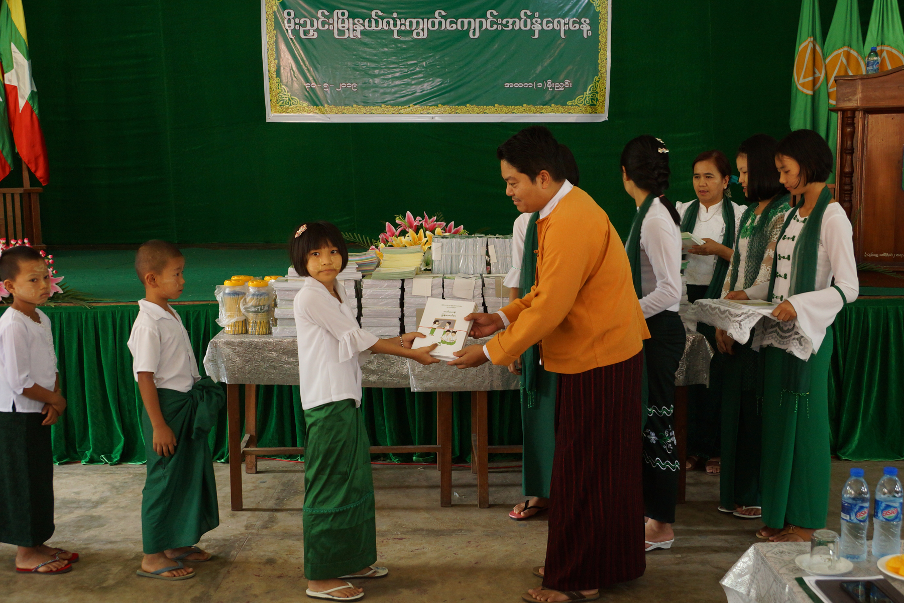 ဆက်လက်၍ အလှူရှင်ဂုဏ်ပြုမှတ်တမ်းလွှာများကို မြို့နယ်ပညာရေးမှူး ဦးခိုင်ဝေကပေးအပ်ခဲ့ရာ အလှူရှင်များ ကိုယ်စားရွှေကိုယ်ပိုင်အထက်တန်းကျောင်းအုပ်က လက်ခံရယူခဲ့သည်။ ယခု ထောက်ပံ့ ပေးအပ်သည့် ပစ္စည်းများကိုမြို့နယ်အတွင်းရှိ ကိုယ်ပိုင်ကျောင်းများနှင့် စေတနာရှင်များက လှူဒါန်းထောက်ပံ့ခဲ့ခြင်းဖြစ်ကြောင်း သိရသည်။