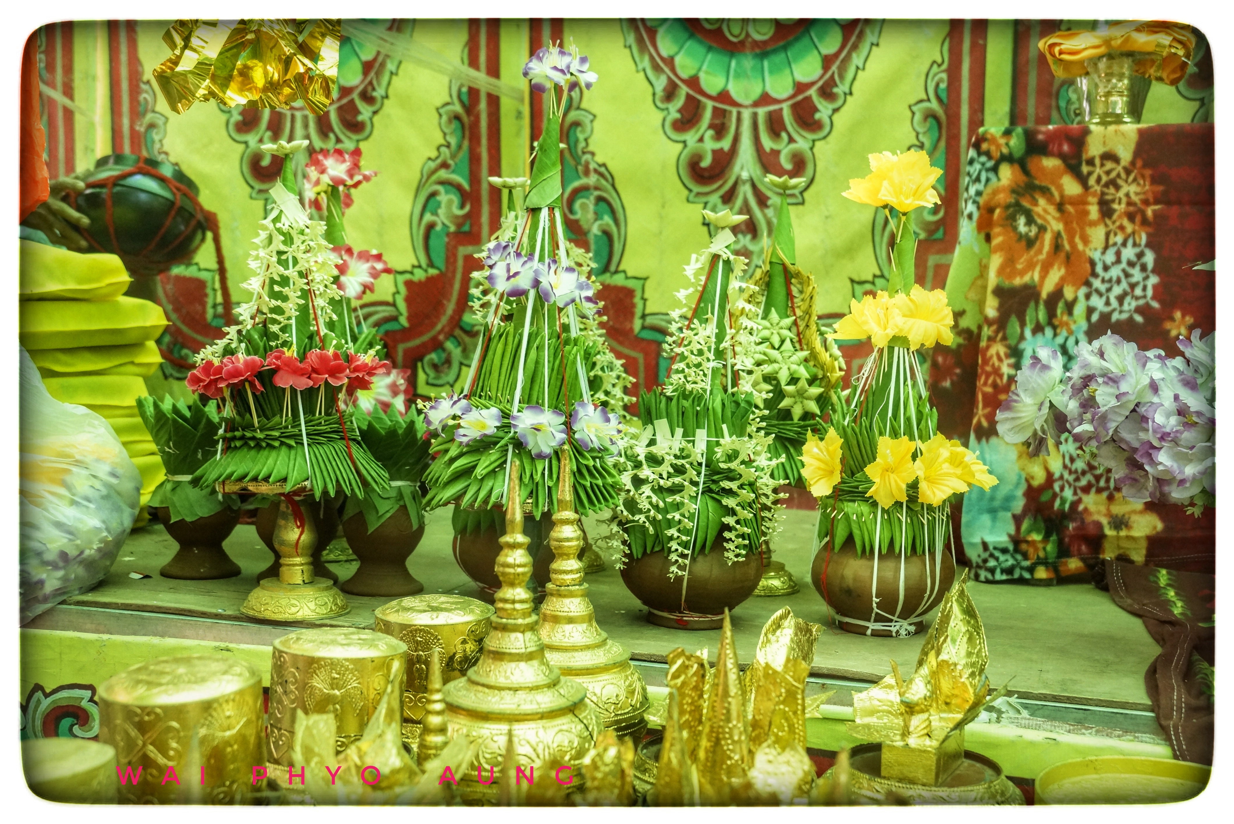 ရွှေကွမ်းတောင် ၊ ရွှေကွမ်းအစ်၊ ဟင်္သာစသည်တို့ကို အသင့်ပြုလုပ်ကာ ရွှေရောင် ငွေရောင်များ ဖန်တီးထားကြသော်လည်း အလှူတစ်ခုတွင် ဖက်စိမ်းကွမ်းတောင် ပါရှိမှသာ အလှူအထမြောက်သည်အထိ ကျေးလက်ဒေသများတွင် မပါမဖြစ် ပြုလုပ်ကြသည်၊၊အလှူရှင်မှ ဖက်ဖြင့် အနုပညာဖန်တီးသူကို ကြိုတင်၍ သေချာစွာ ဖိတ်ကြားရသည်။