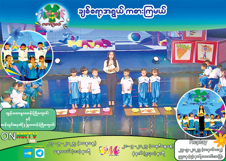 “ချစ်စရာ့အရွယ်ကစားကြမယ်”ကလေးအစီအစဉ်ကို MRTV - HD Channelမှ အပတ်စဉ် စနေနေ့တိုင်း ထုတ်လွှင့်ပြသလျက်ရှိရာ စက်တင်ဘာ ၂၇ ရက် (စနေနေ့) နံနက် ၁၁ နာရီတွင် ကျွန်းတောမူလတန်းကြိုကျောင်းနှင့် သန်လျင်အမှတ်(၄)မူလတန်းကြိုကျောင်းတို့မှ ကလေးငယ်များ ပါဝင်ကစားကြပုံများကို မြန်မာ့အသံနှင့်ရုပ်မြင်သံကြား၏ MRTV-HD Channel မှ ဆက်လက် ထုတ်လွှင့်ပြသမည်ဖြစ်သည်။