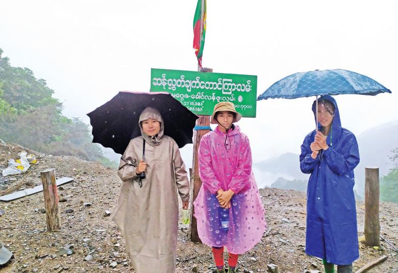 ကျွန်တော်တို့ရှေ့မှ ကားဖြင့်တက်သွားသော ကိုဂျေရဲဆာနှင့် MRTV မှ ကိုဂျုန်းတောင်တို့ အထမ်းသမားများ ခေါ်ရန် တောင်အောက်သို့ ကျွန်တော်တို့မရောက်မီကပင် ဆင်းသွားကြသည်။ တောင်ထိပ်၌ ကျွန်တော်တို့ အထုပ်အပိုးများကို ပလတ်စတစ်ဖြင့်အုပ်လျက် ထားခဲ့သည်။ မိုးများသဲသဲမဲမဲရွာလာသည်။ လေများလည်း တဟူးဟူး တိုက်နေသည်။ တောင်ထိပ်သို့ မောမောပန်းပန်း တက်ခဲ့ရသော ကျွန်တော်တို့နှင့် ဆရာမသုံးယောက် တောင်ထိပ်၌ မိုးထဲရေထဲ ဒုက္ခပင်ပန်းဆင်းရဲကြီးစွာကြုံတွေ့နေရပြီ။