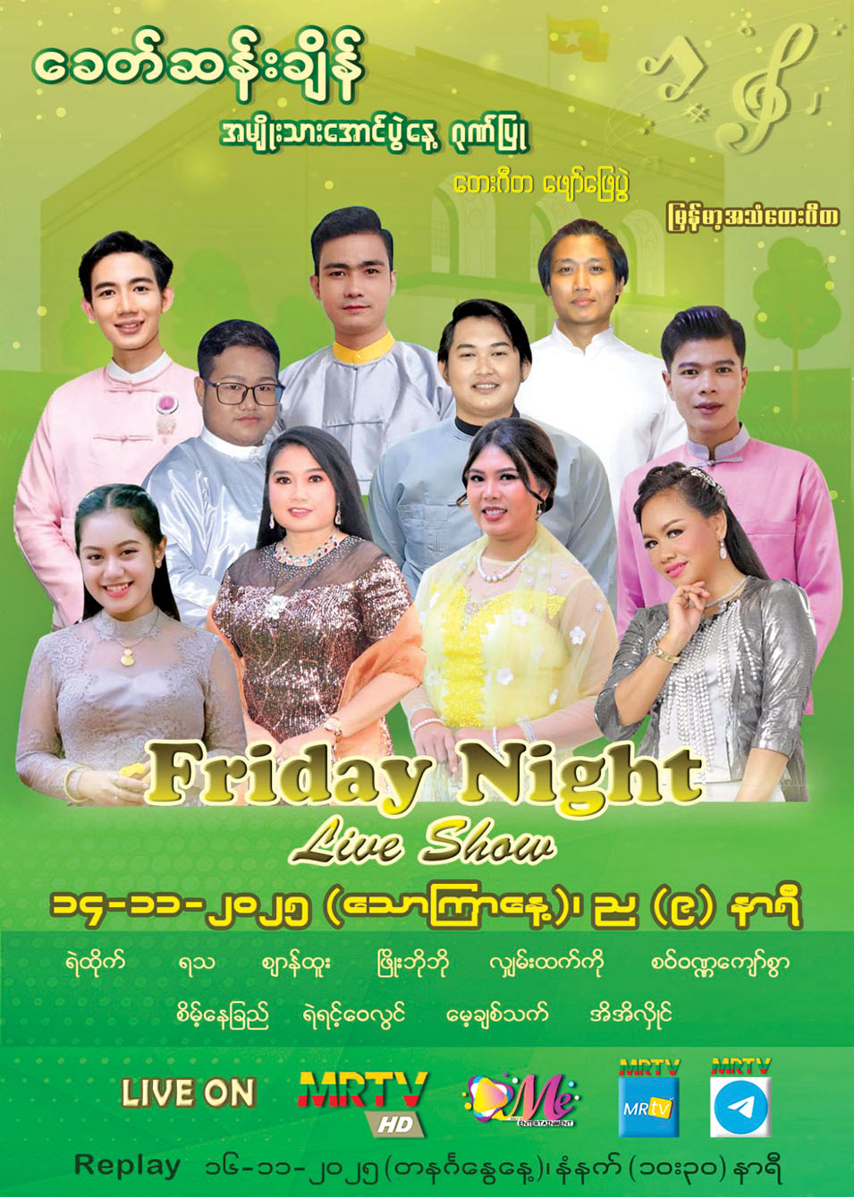 မြန်မာ့အသံနှင့် ရုပ်မြင်သံကြားအနေဖြင့် ပြည်သူများ အပန်းပြေစေရန်နှင့် စိတ်ခွန်အားသစ်များ ရရှိနိုင်ရန်ရည်ရွယ်ပြီး Friday Night Live Show တေးဂီတဖျော်ဖြေပွဲများကို ဆန်းသစ် တင်ဆက်လျက်ရှိရာ (၁၀၅)နှစ်မြောက် အမျိုးသားအောင်ပွဲနေ့ကို ဂုဏ်ပြုသောအားဖြင့် “ခေတ်ဆန်းချိန်” အမျိုးသားအောင်ပွဲနေ့ ဂုဏ်ပြု တေးဂီတဖျော်ဖြေပွဲကို နိုဝင်ဘာ ၁၄ ရက် (သောကြာနေ့) ည ၉ နာရီခန့်တွင် မြန်မာ့အသံနှင့် ရုပ်မြင်သံကြား၏ MRTV-HD Channel နှင့် MRTV Entertainment Channel တို့မှ တိုက်ရိုက် (Live) ထုတ်လွှင့် ပြသမည်ဖြစ်သည်။