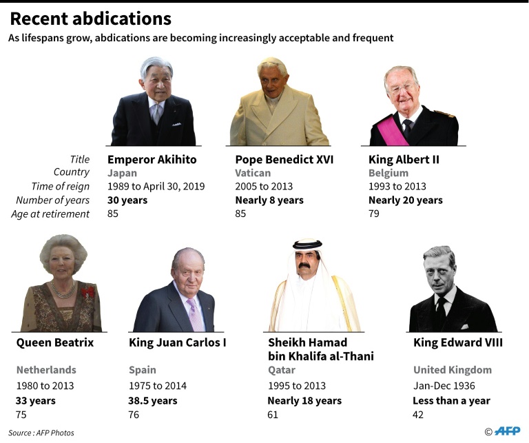 အသက် ၈၅ နှစ်အရွယ် ဂျပန်ဧကရာဇ် အာကီဟီတို ဟာ ၂၀၁၉ ခုနှစ် ဧပြီ ၃၀ ရက်နေ့မှာ ဘုရင်ရာထူးကနေ သမိုင်းဝင်တဲ့ နှုတ်ထွက်မှု ပြုလုပ်မှာဖြစ်ပါတယ်။ ပုပ်ရဟန်းမင်း နဲ့ ဘုရင်တွေ ရာထူးကနေ နှုတ်ထွက်ပေးရာတွင် ဂျပန်ဧကရာဇ်က ခေတ်သစ်ရဲ့ နောက်ဆုံးတစ်ယောက် ဖြစ်လာပါတယ်။ အာကီဟီတိုဟာ ဧကရာဇ်အဖြစ် အနှစ် ၃၀ တာဝန်ထမ်းဆောင်ခဲ့ပါတယ်။