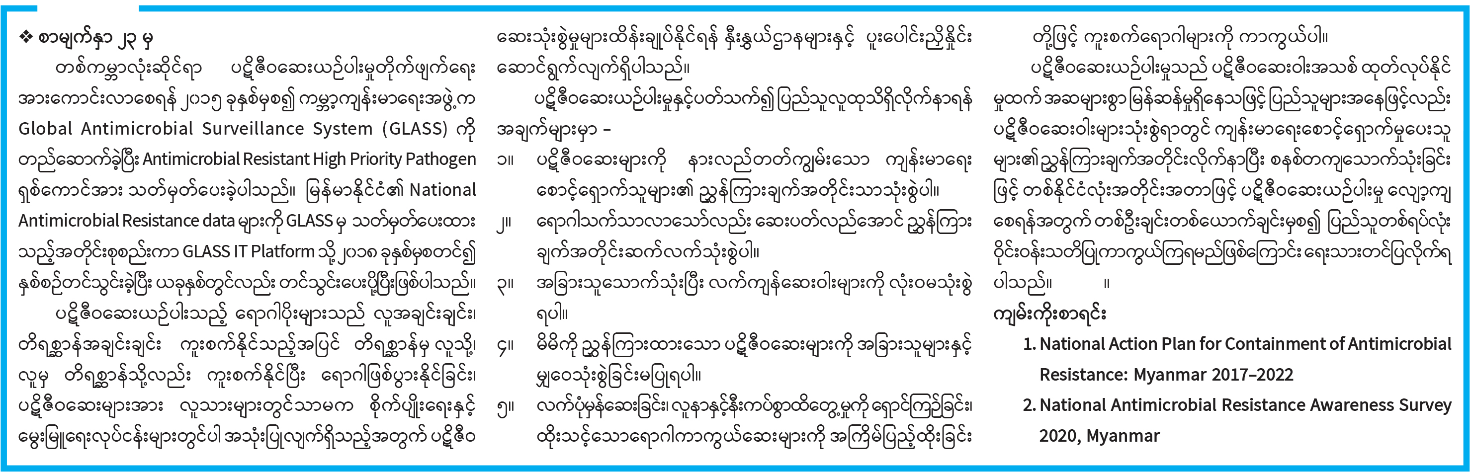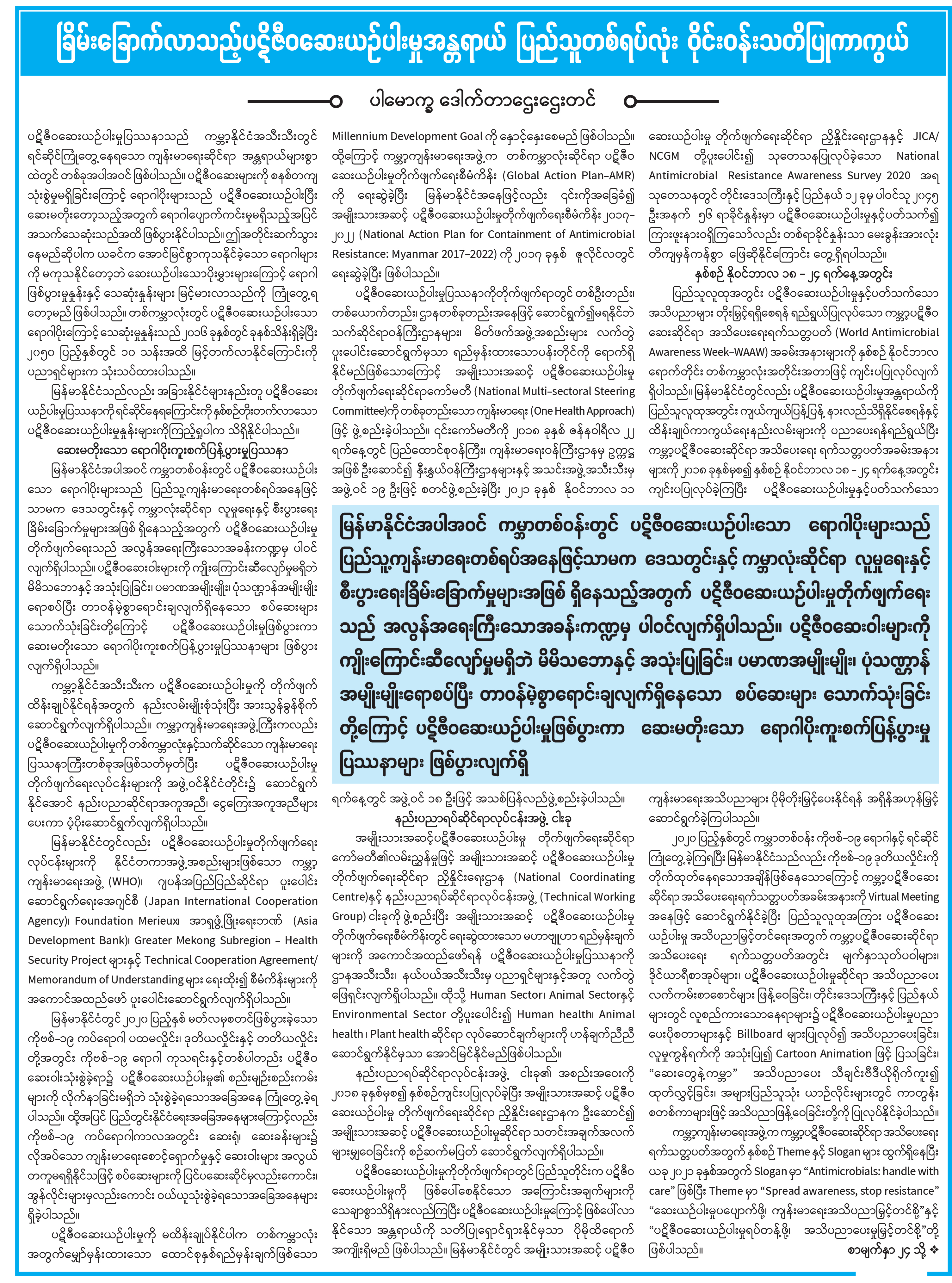 ခြိမ်းခြောက်လာသည့်ပဋိဇီဝဆေးယဉ်ပါးမှုအန္တရာယ် ပြည်သူတစ်ရပ်လုံး ဝိုင်းဝန်းသတိပြုကာကွယ်