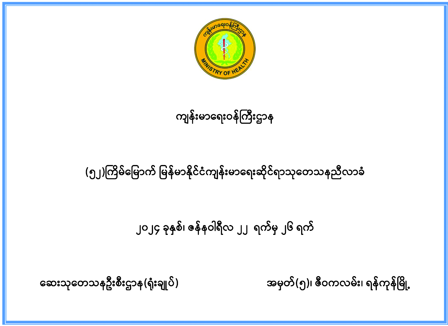 ကျန်းမာရေးဝန်ကြီးဌာနက ကြီးမှူးကျင်းပသည့် “(၅၂) ကြိမ်မြောက် မြန်မာနိုင်ငံ ကျန်းမာရေးဆိုင်ရာ သုတေသနညီလာခံကို  ၂၀၂၄ ခုနှစ် ဇန်နဝါရီလ   ၂၂  ရက်နေ့မှ ၂၆ ရက်နေ့အထိ ရန်ကုန်မြို့ ဒဂုံမြို့နယ် အမှတ်- ၅   ဇီဝကလမ်းရှိ ဆေးသုတေသနဦးစီးဌာန(ရုံးချုပ်)တွင် ကျင်းပမည် ဖြစ်ပါသည်။