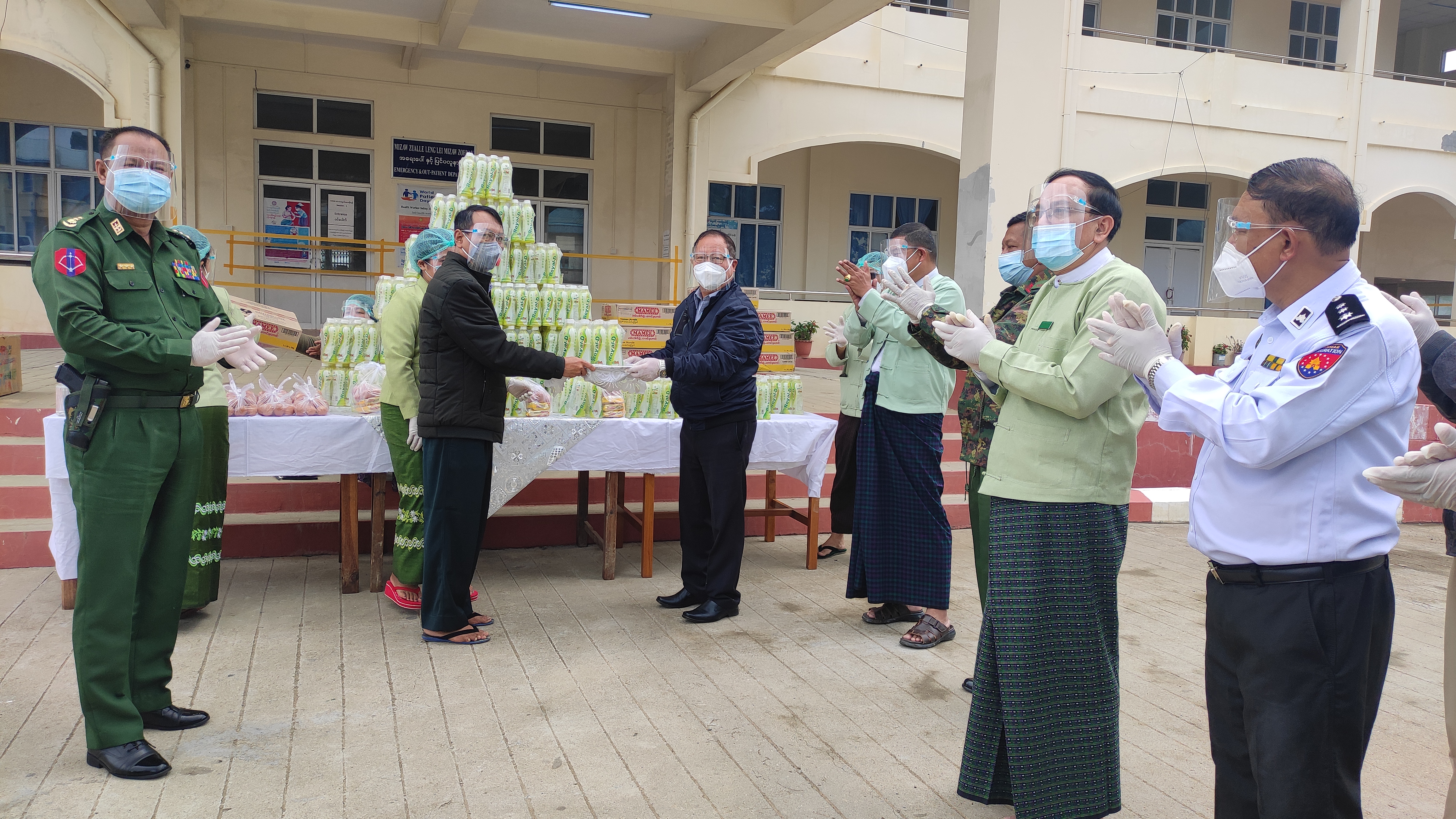 ထို့နောက် နံနက် ၁၀ နာရီ မိနစ် ၄၀ တွင် ဟားခါးမြို့ပြည်သူ့ဆေးရုံကြီးသို့ သွားရောက်ပြီး ပြည်သူ့ဆေးရုံရှိ ကျန်းမာရေးဝန်ထမ်းများနှင့် တွေ့ဆုံကာ ပိုးတွေ့လူနာများနှင့် ကျန်းမာရေးဝန်ထမ်းများအတွက် အဟာရဖြစ် အစားအစာများဖြစ်သော ကြက်ဥ၊ ခေါက်ဆွဲခြောက်ထုပ်နှင့် အားဖြည့်အချိုရည်ဘူးများကို ပြည်နယ်စီမံအုပ်ချုပ်ရေးကောင်စီဉက္ကဋ္ဌနှင့်အဖွဲ့က ပေးအပ်ရာ ဟားခါးမြို့ပြည်သူ့ဆေးရုံအုပ် ဒေါက်တာရန်နိုင်က လက်ခံရယူသည်။ ဆက်လက်၍ ပြည်နယ်စီမံအုပ်ချုပ်ရေးကောင်စီဉက္ကဋ္ဌနှင့် အဖွဲ့သည် ဟားခါးမြို့ပြည်သူ့ဆေးရုံအုပ်ကြီးနှင့် ကျန်းမာရေးဝန်ထမ်းများအား လိုအပ်သည်များ မှာကြားပြီး ပိုးတွေ့လူနာများကိုလည်း အားပေးစကား ပြောကြားခဲ့ကြောင်း သိရသည်။