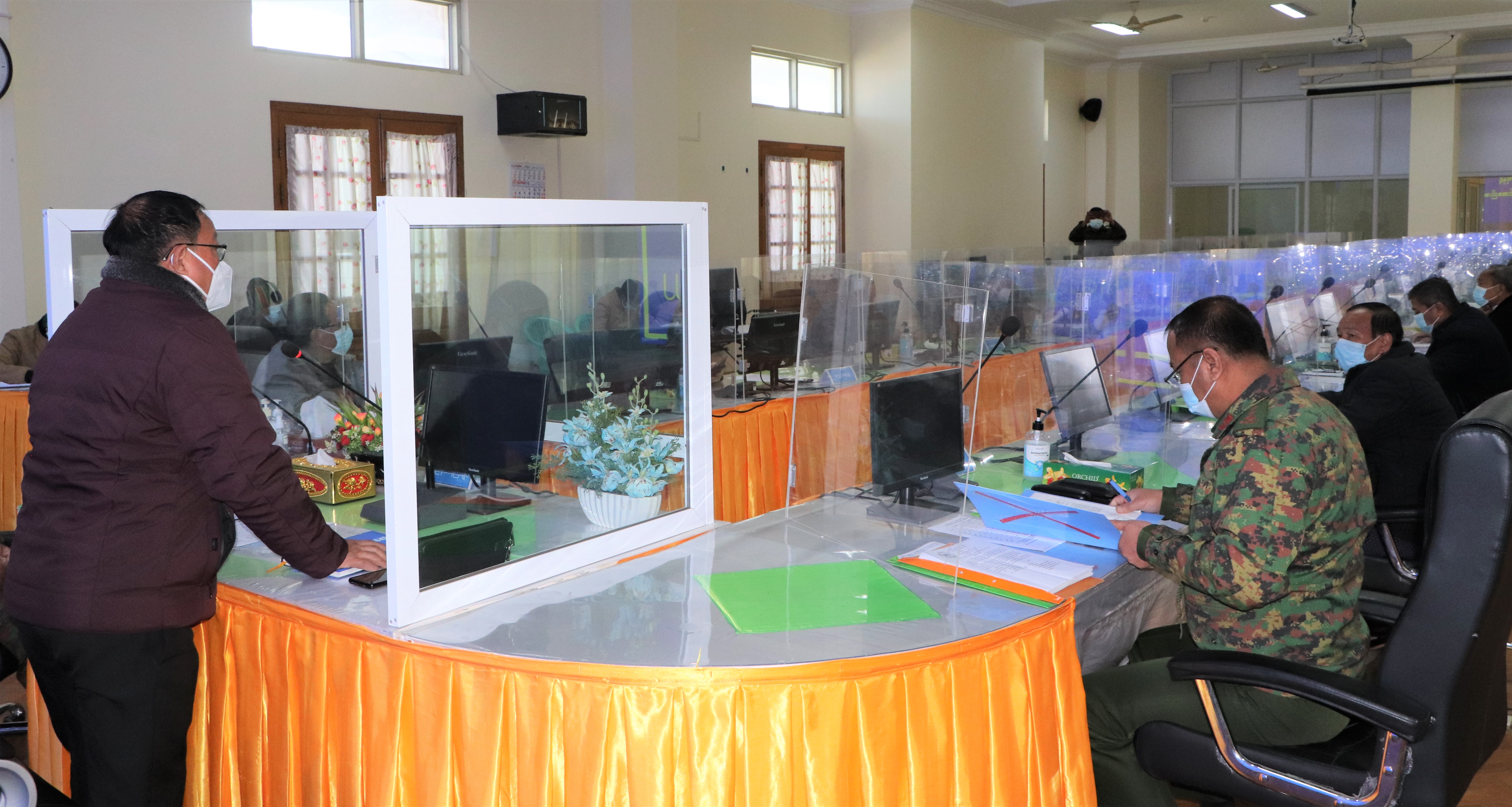 ဆက်လက်၍ တက်ရောက်လာကြသည့် ဌာနဆိုင်ရာ တာဝန်ရှိသူများက ပြည်နယ်အတွင်း ကိုဗစ်-၁၉ ရောဂါ ကာကွယ်၊ ထိန်းချုပ်၊ ကုသရေးလုပ်ငန်းများ ဆောင်ရွက်မှုအခြေအနေ၊ ကာကွယ်ဆေးထိုးနှံခြင်း လုပ်ငန်းဆောင်ရွက်မှုနှင့် ဆက်လက်ဆောင်ရွက်မည့် အစီအမံ၊ ချွန်ကျုံးကျေးရွာအတွက် ကိုဗစ်-၁၉ ရောဂါ ကာကွယ်ကုသဆေးများ ထောက်ပံ့ပေးမှု အခြေအနေ၊ ချင်းပြည်နယ်မှ ဝယ်ယူထားသည့် ဆေးဝါးပစ္စည်းများ သက်ဆိုင်ရာ မြို့နယ်များသို့ သယ်ယူပို့ဆောင်နိုင်ရေး ဆောင်ရွက်မှုအခြေအနေ၊ ယခင်အပတ် အစည်းအဝေး ဆုံးဖြတ်ချက်များအပေါ် ဆောင်ရွက်ပြီးစီးမှုအခြေနေများကို ရှင်းလင်းတင်ပြကြသည်။