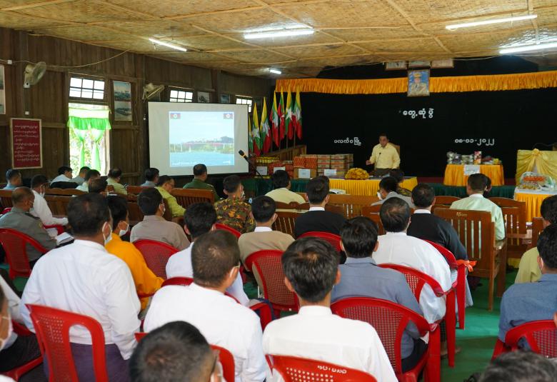 ယင်းနောက် ပြည်နယ်ဝန်ကြီးချုပ်က ခရိုင်နှင့် မြို့နယ်ဌာနဆိုင်ရာ ဝန်ထမ်းများအတွက် အခြေခံ စားသောက်ကုန်များ ပေးအပ်ရာ ခရိုင်စီမံအုပ်ချုပ်ရေးအဖွဲ့ ဥက္ကဋ္ဌကလည်းကောင်း၊ လုံခြုံရေးနှင့် နယ်စပ်ရေးရာဝန်ကြီး ဗိုလ်မှူးကြီး ဟန်ဝင်းအောင်က ပေးအပ်ရာ ခရိုင်ရဲတပ်ဖွဲ့မှူးကလည်းကောင်း၊ ပြည်နယ်အစိုးရအဖွဲ့ အတွင်းရေးမှူး ဦးမောင်မောင်ဆန်းက ပေးအပ်ရာ မြို့နယ်စီမံအုပ်ချုပ်ရေး အဖွဲ့ဝင်တစ်ဦးကလည်းကောင်း အသီးသီးလက်ခံရယူကြသည်။