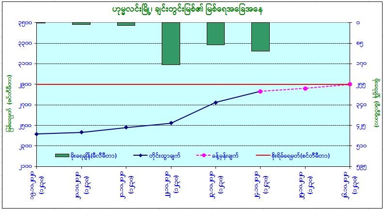ယနေ့မြန်မာစံတော်ချိန် (၁၂:၃၀)နာရီအချိန် တိုင်းထွာချက်အရ ချင်းတွင်းမြစ်ရေသည်ဟုမ္မလင်းမြို့တွင် ယင်းမြို့၏ စိုးရိမ်ရေမှတ်အောက် (၂) ပေခန့်တွင် ရောက်ရှိနေပါသည်။ အဆိုပါမြစ်ရေသည် နောက်(၂) ရက်အတွင်း ယင်းမြို့၏ စိုးရိမ်ရေမှတ်သို့ ရောက်ရှိနိုင်ပါတယ်။