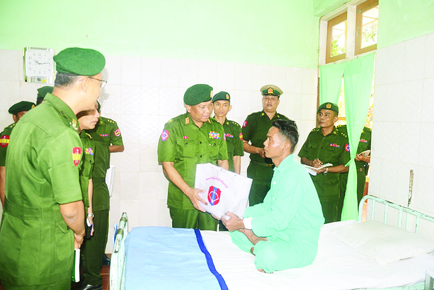 စစ်ကိုင်းတိုင်းဒေသကြီး ခန္တီးမြို့ရှိ တပ်မတော်ဆေးရုံ၌ တက်ရောက်ကုသမှုခံယူလျက်ရှိသော အရာရှိ၊ စစ်သည်၊ မိသားစုဝင်များ၊ မြန်မာနိုင်ငံရဲတပ်ဖွဲ့ဝင်များ၊ စစ်မှုထမ်းဟောင်းအဖွဲ့ဝင်များ၊ ပြည်သူ့စစ် (ဌာနေ)တပ်ဖွဲ့ဝင်များနှင့် ဒေသခံပြည်သူများအား ယနေ့မွန်းလွဲပိုင်းတွင် အနောက်မြောက်တိုင်းစစ် ဌာနချုပ်တိုင်းမှူး ဗိုလ်မှူးချုပ် မျိုးမင်းထွေးနှင့် တာဝန်ရှိသူများက သွားရောက်ကြည့်ရှု၍ တစ်ဦးချင်း၏ ရောဂါဖြစ်ပွားမှု၊ ဆေးဝါးကုသပေးထားမှုနှင့် ကျန်းမာရေးတိုးတက်ကောင်းမွန် မှုအခြေအနေများကို မေးမြန်းအားပေးစကားပြောကြားကာ အာဟာရဖြည့်စားသောက် ဖွယ်ရာများနှင့် ချီးမြှင့်ငွေများ ပေးအပ်သည်။