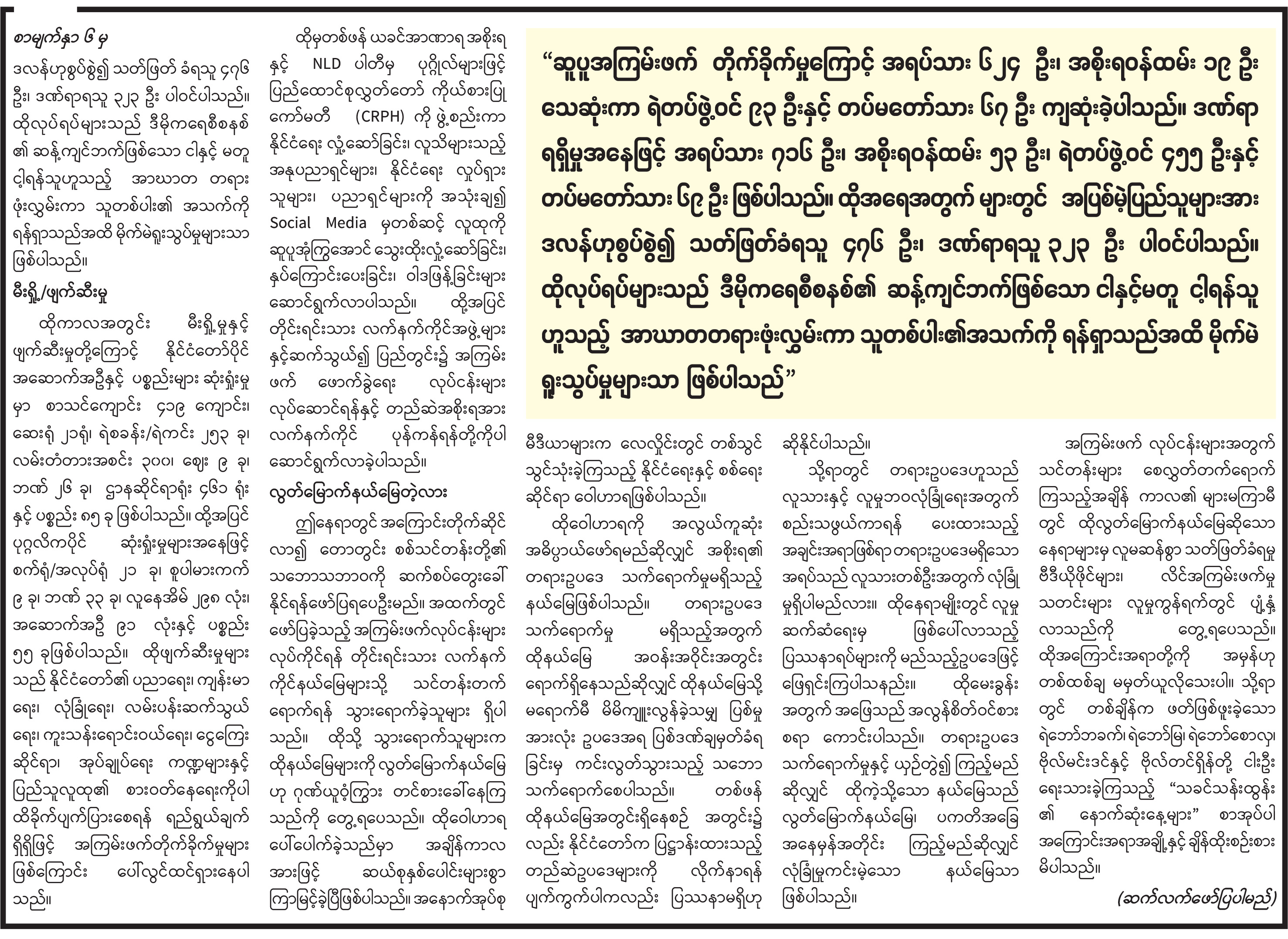 နိုင်ငံတည်ငြိမ်အေးချမ်းပြီး တရားဥပဒေစိုးမိုးမှုရှိစေရေး မိမိတို့အနေဖြင့် ဒီမိုကရေစီနည်းလမ်းဖြင့် ဆောင်ရွက်လျက်ရှိ တည်ငြိမ်အေးချမ်းပြီး တရားဥပဒေစိုးမိုးမှုရှိမှသာ ပြည်သူများ အလုပ်အကိုင်များ အဆင်ပြေချောမွေ့ပြီး နိုင်ငံဖွံ့ဖြိုးတိုးတက်လာမည်
