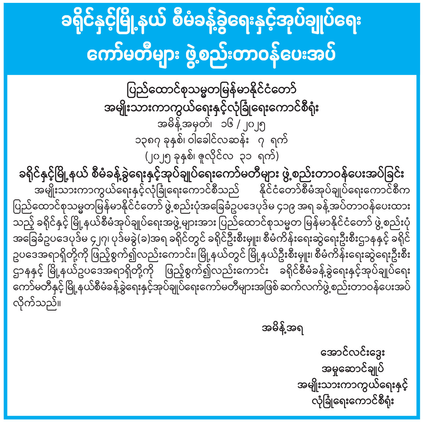 ခရိုင်နှင့်မြို့နယ် စီမံခန့်ခွဲရေးနှင့်အုပ်ချုပ်ရေး ကော်မတီများ ဖွဲ့စည်းတာဝန်ပေးအပ်