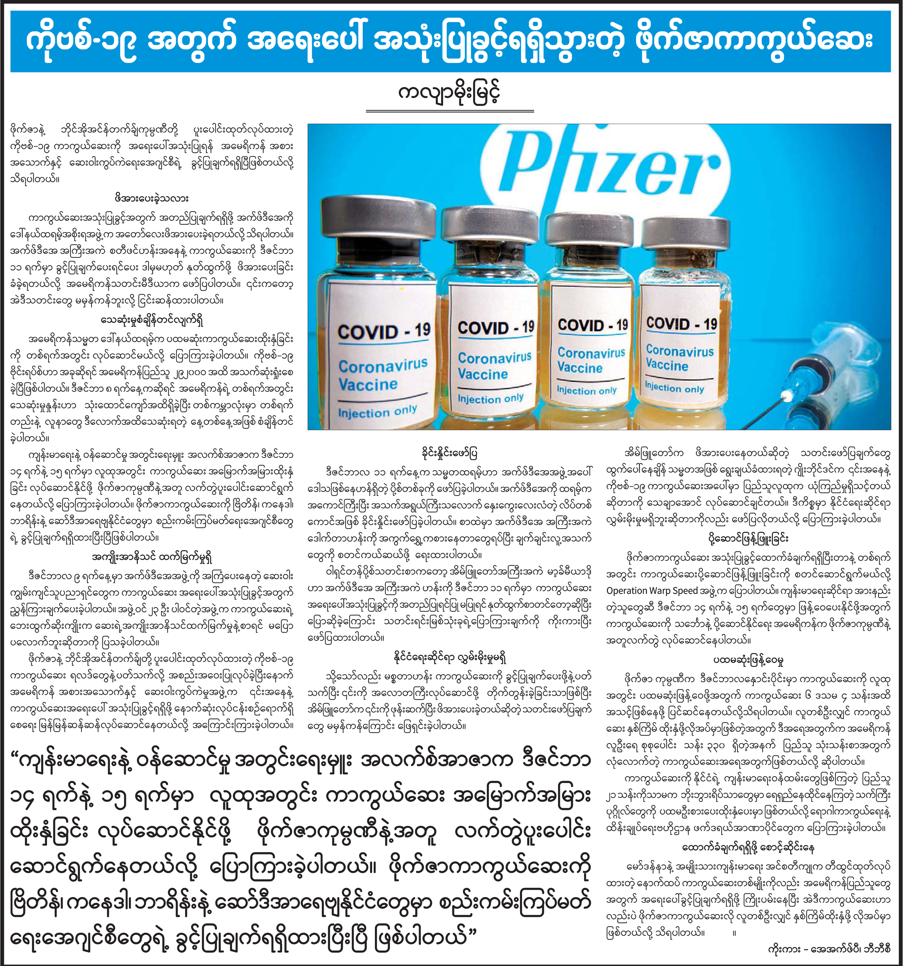 ကိုဗစ်-၁၉ အတွက် အရေးပေါ် အသုံပြုခွင့်ရရှိသွားတဲ့ ဖိုက်ဇာကာကွယ်ဆေး