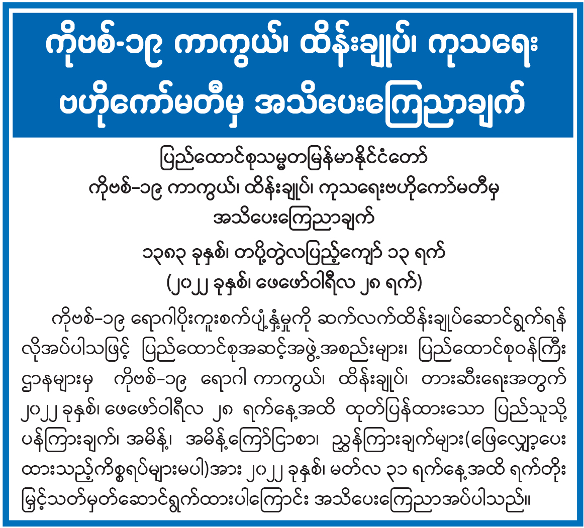 ကိုဗစ်-၁၉ ကာကွယ်၊ ထိန်းချုပ်၊ ကုသရေး ဗဟိုကော်မတီမှ အသိပေးကြေညာချက်