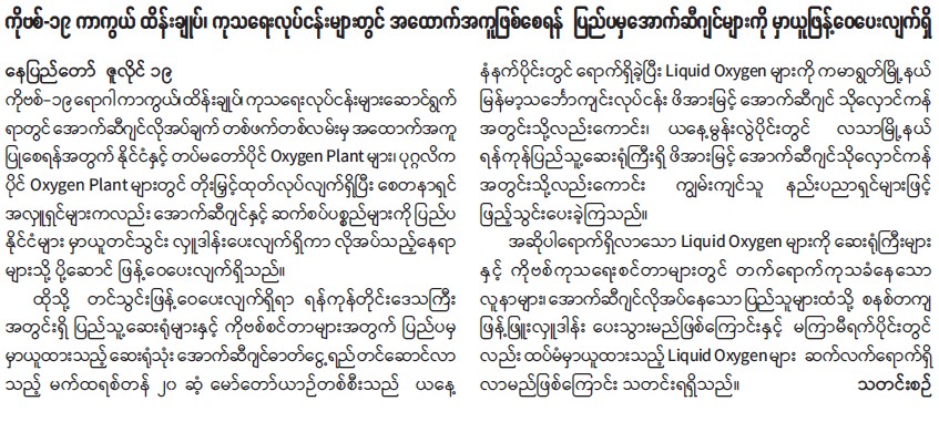 ကိုဗစ် - ၁၉ ကာကွယ် ထိန်းချုပ်၊ ကုသရေးလုပ်ငန်းများတွင် အထောက်အကူဖြစ်စေရန် ပြည်ပမှ အောက်ဆီဂျင်များကို မှာယူဖြန့်ဝေပေးလျက်ရှိ