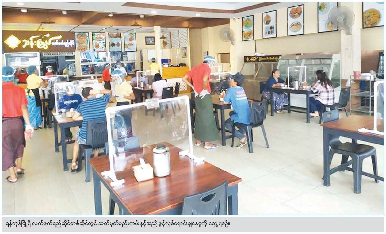အစိုးရဌာနဆိုင်ရာတွေ၊ ကုမ္ပဏီတွေမှာ ဝန်ထမ်းတွေ ရက်ပြည့်တာဝန်ထမ်းဆောင် နေကြပါပြီ။ ဝန်ထမ်းတွေ လုပ်ငန်းခွင် ပြန်ဝင်ကြပြီဆိုတော့ အများပြည်သူစီး လိုင်းကားတွေ အပြည့်ပြန်ထွက်နေကြပါပြီ။ စားသောက် ဆိုင်တွေကိုလည်း သတ်မှတ်စည်းကမ်းတွေနဲ့ အညီ ပြန်လည်ဖွင့်ခွင့်တွေ ပေးခဲ့ပါပြီ။ ခရီး ဝေးလိုင်းကားကြီးတွေ ပြန်ထွက်ခွင့်ပြုခဲ့ပါပြီ။ အစည်းအဝေးပွဲတွေ၊ အလုပ်ရုံဆွေးနွေးပွဲတွေ ကိုလည်း ကျန်းမာရေးနှင့် အားကစားဝန်ကြီး ဌာနရဲ့သတ်မှတ်ညွှန်ကြားချက်တို့နဲ့အညီ ပြန်လည်ဖွင့်ခွင့်တွေ ပေးထားပြီးဖြစ်ပါတယ်။ နောက်ဆုံး ရုပ်ရှင်လောကသားတွေအတွက် ရိုက်ကူးရေး တွေတောင် ခွင့်ပြုခဲ့ပြီးဖြစ်ပါတယ်။