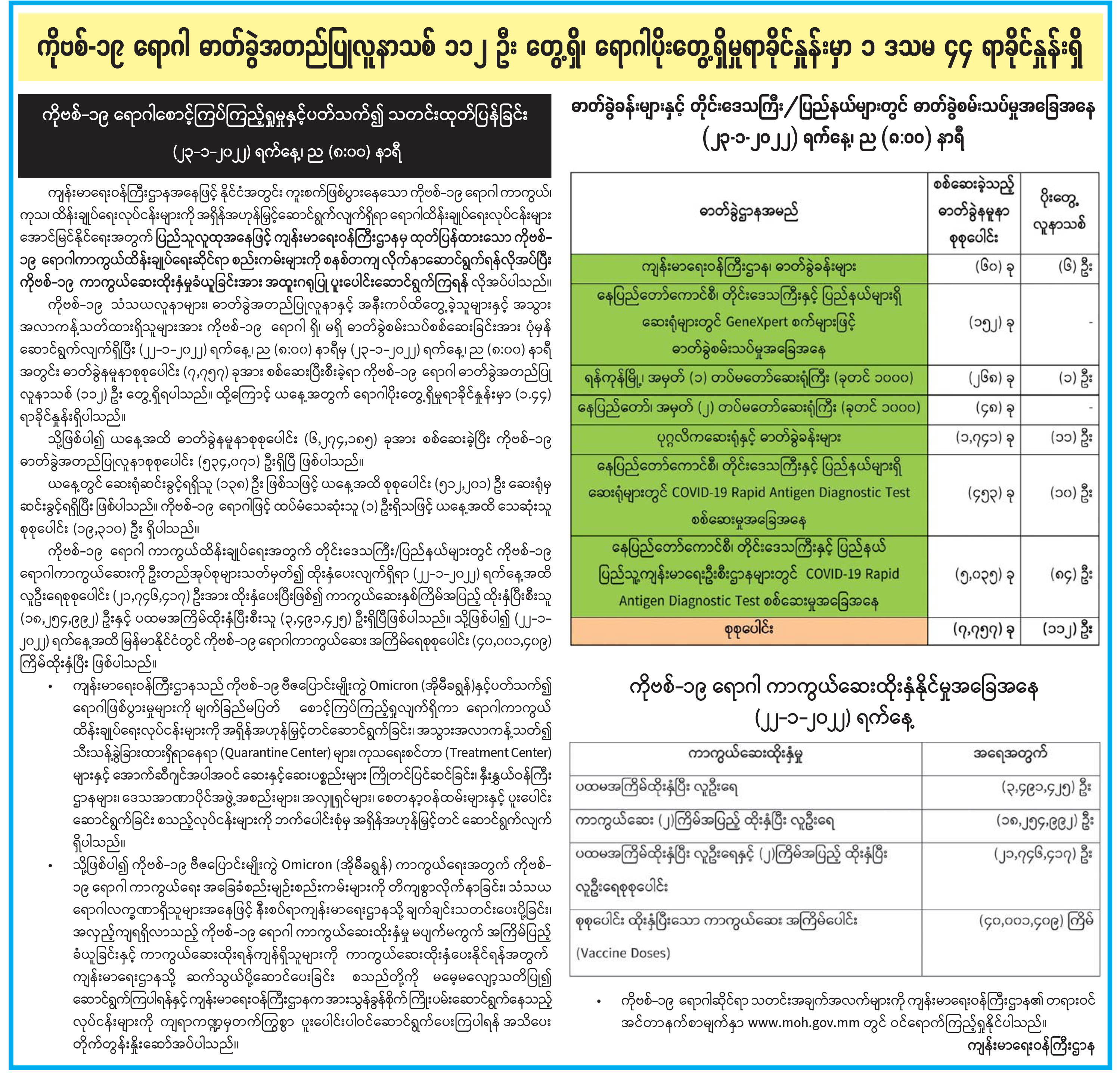 ကိုဗစ်-၁၉ ရောဂါ ဓာတ်ခွဲအတည်ပြုလူနာသစ် ၁၁၂ ဦးတွေ့ရှိ၊ ရောဂါပိုးတွေ့ရှိမှုရာခိုင်နှုန်းမှာ ၁ ဒသမ ၄၄ ရာခိုင်နှုန်းရှိ
