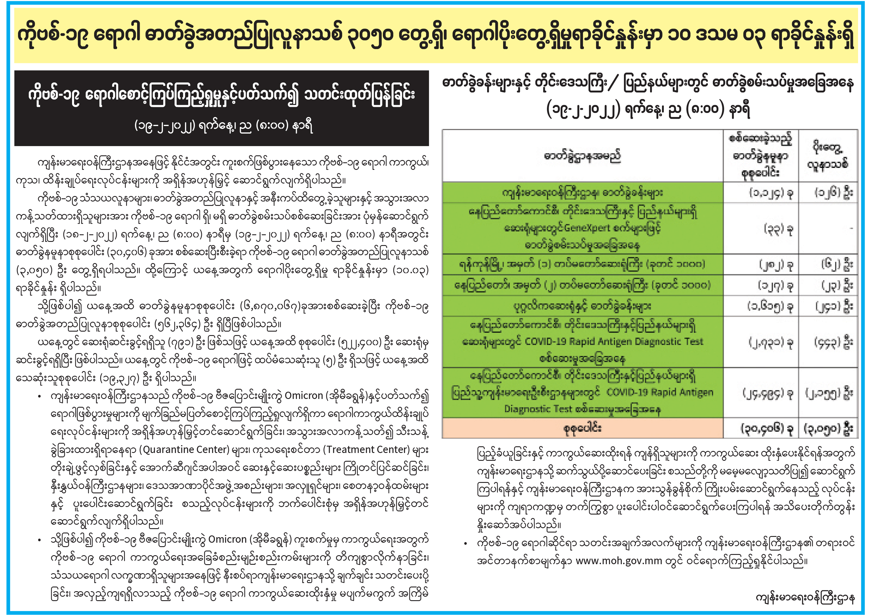 ကိုဗစ်-၁၉ ရောဂါ ဓာတ်ခွဲအတည်ပြုလူနာသစ် ၃၀၅၀ တွေ့ရှိ၊ ရောဂါပိုးတွေ့ရှိမှုရာခိုင်နှုန်းမှာ ၁၀ ဒသမ ၀၃ ရာခိုင်နှုန်းရှိ