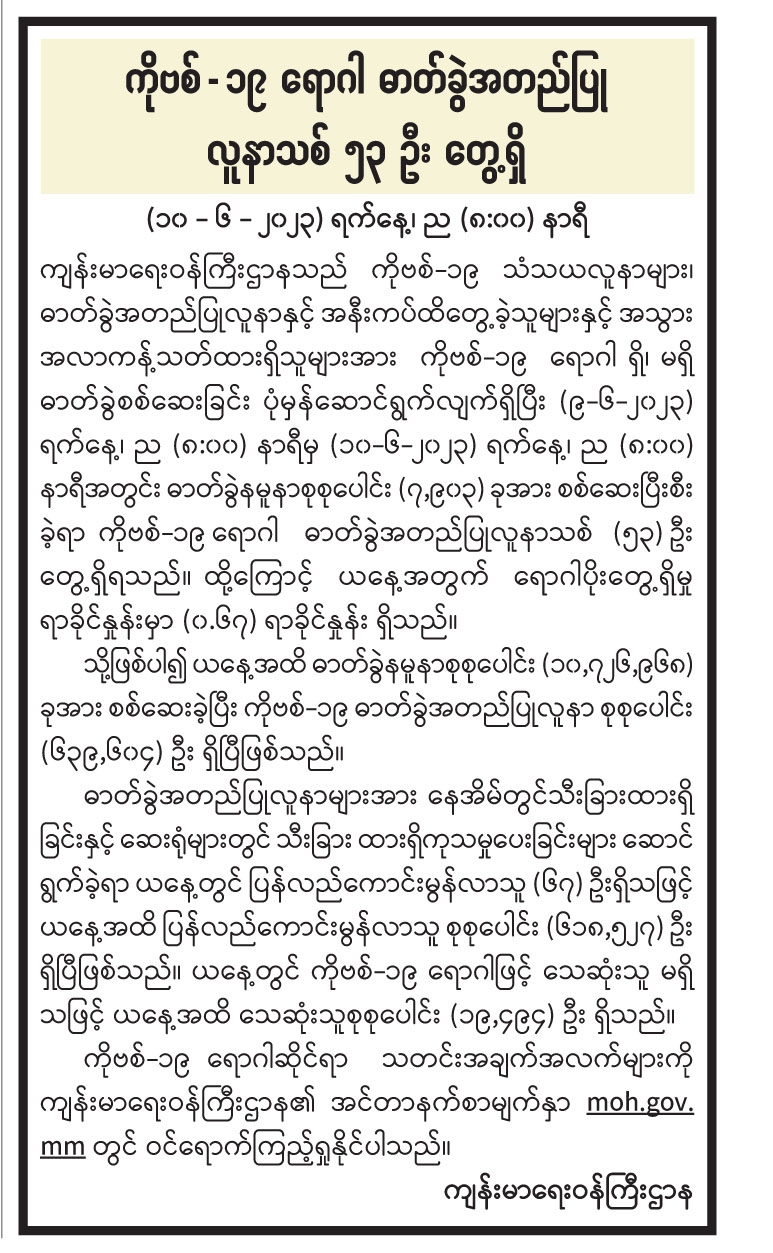 ကိုဗစ်-၁၉ ရောဂါ ဓာတ်ခွဲအတည်ပြုလူနာသစ် ၅၃ ဦး တွေ့ရှိ